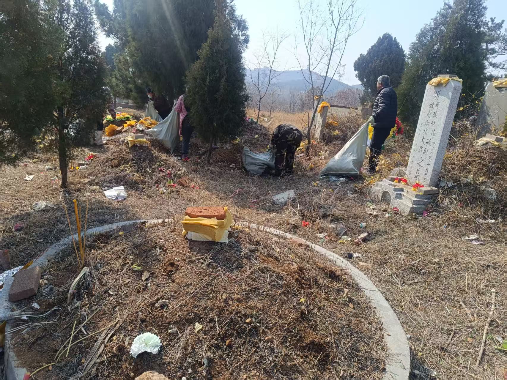2026年3月17号,潮水三村开展清理坟区杂物志愿活动,志愿者们手拿便利袋和铁锹把坟区清理干净,还坟区一个干净整洁的环境