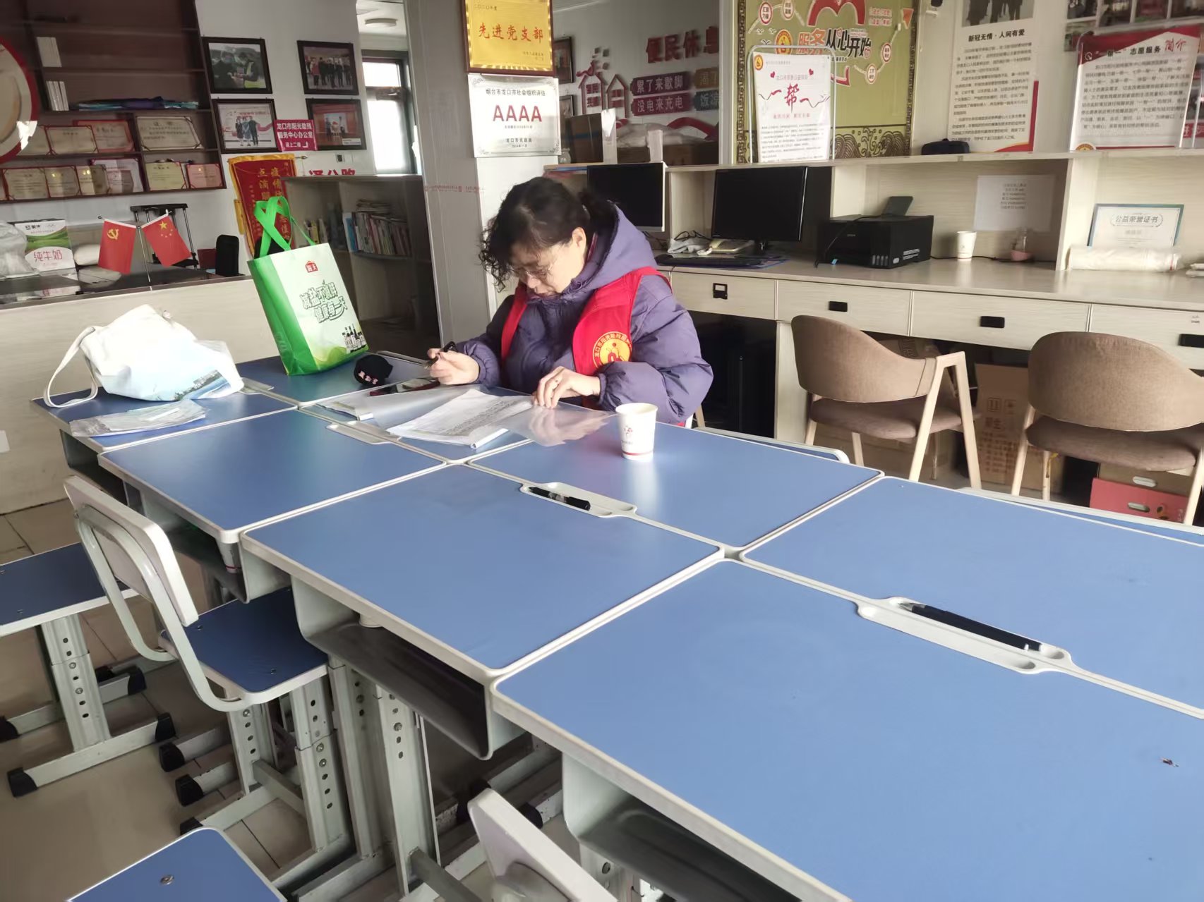 龙口市阳光助残服务中心志愿者们在阳光助残雷锋驿站开展常规值班、志愿者整理活动资料、打扫卫生、二实小护学岗、公益排练等志愿活动