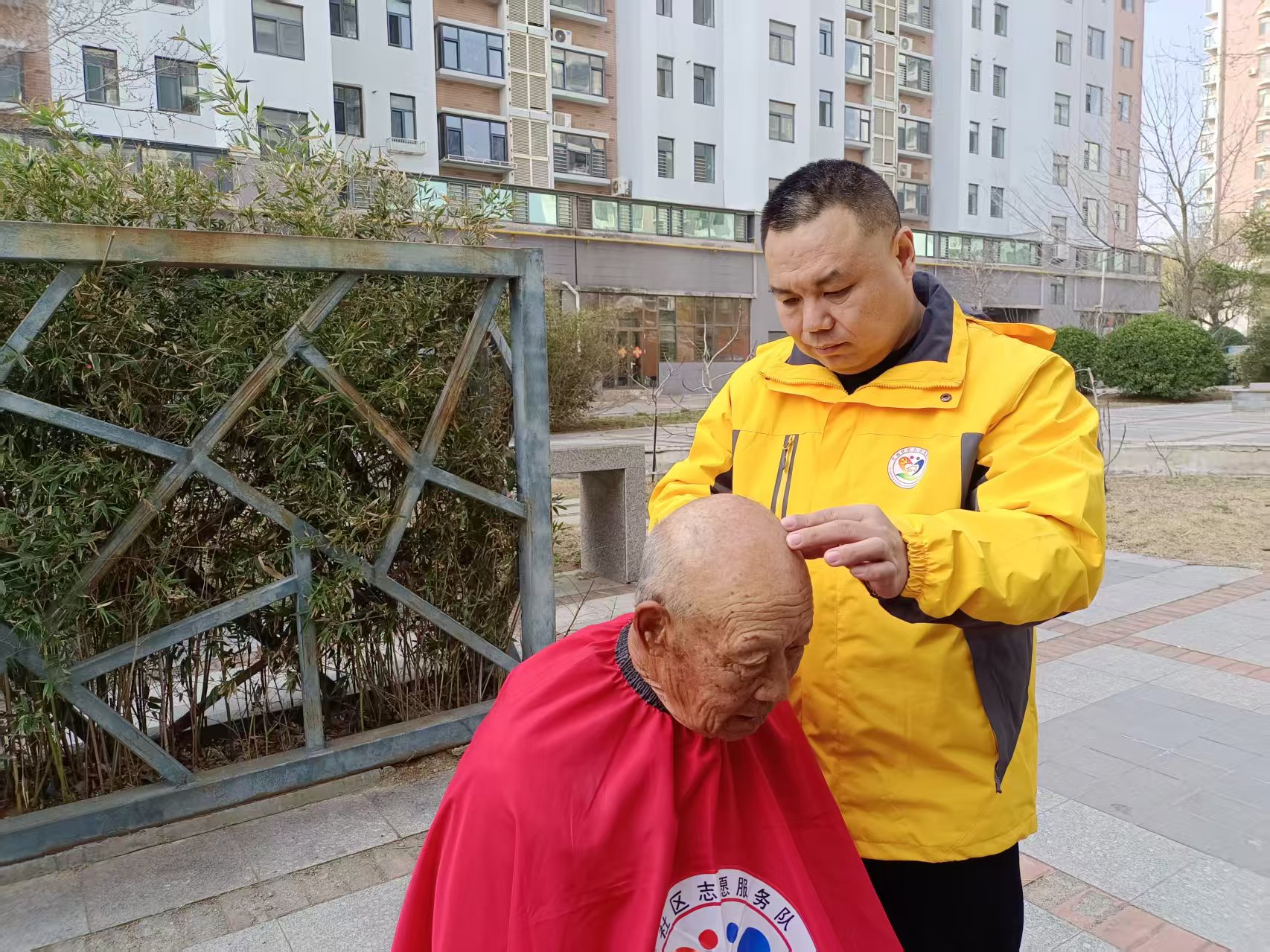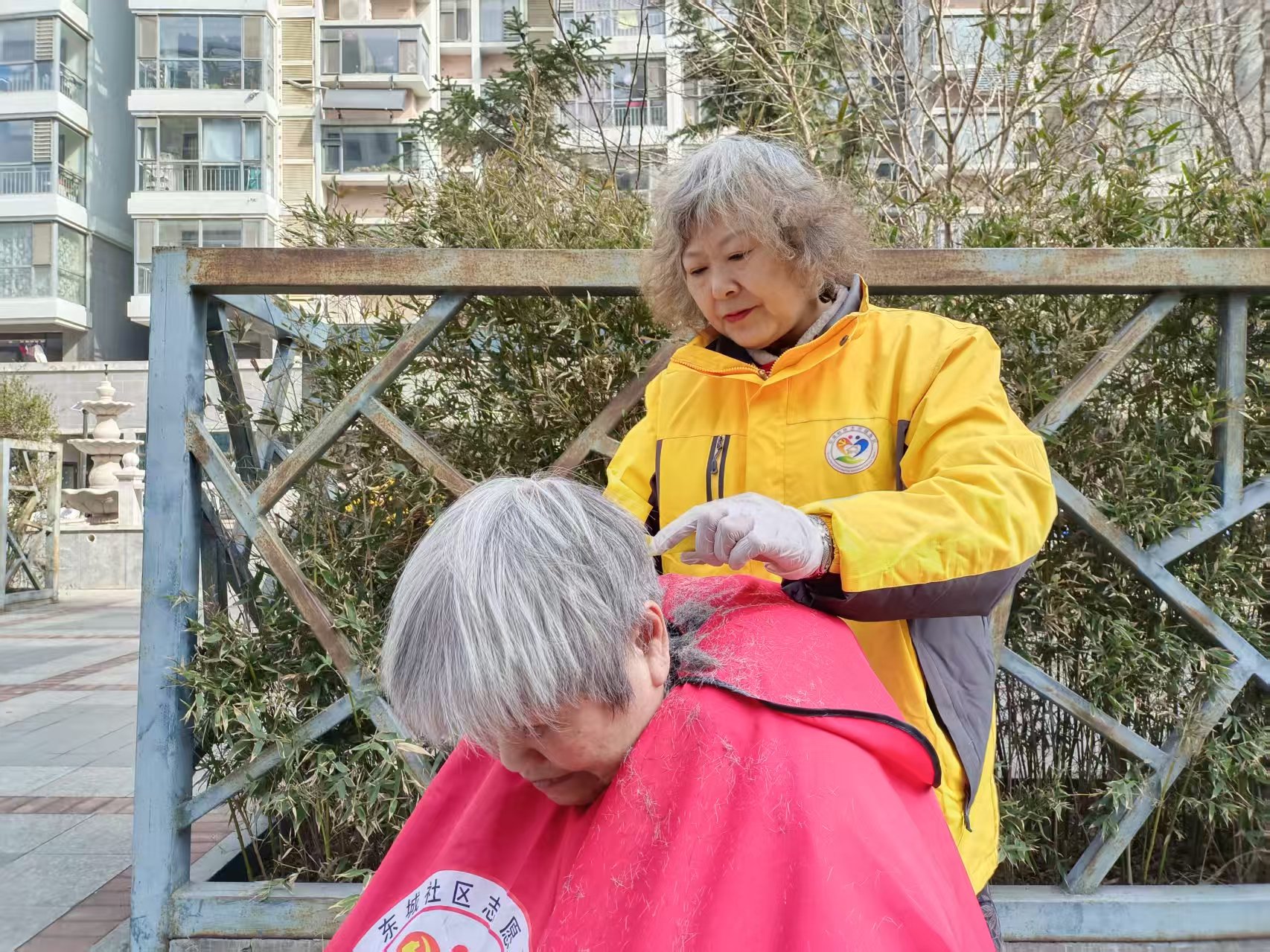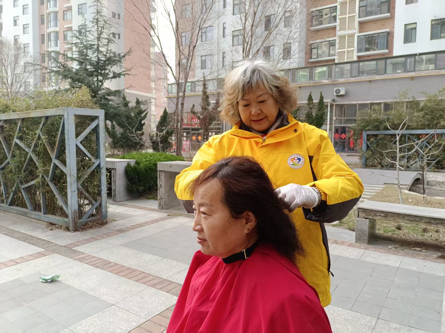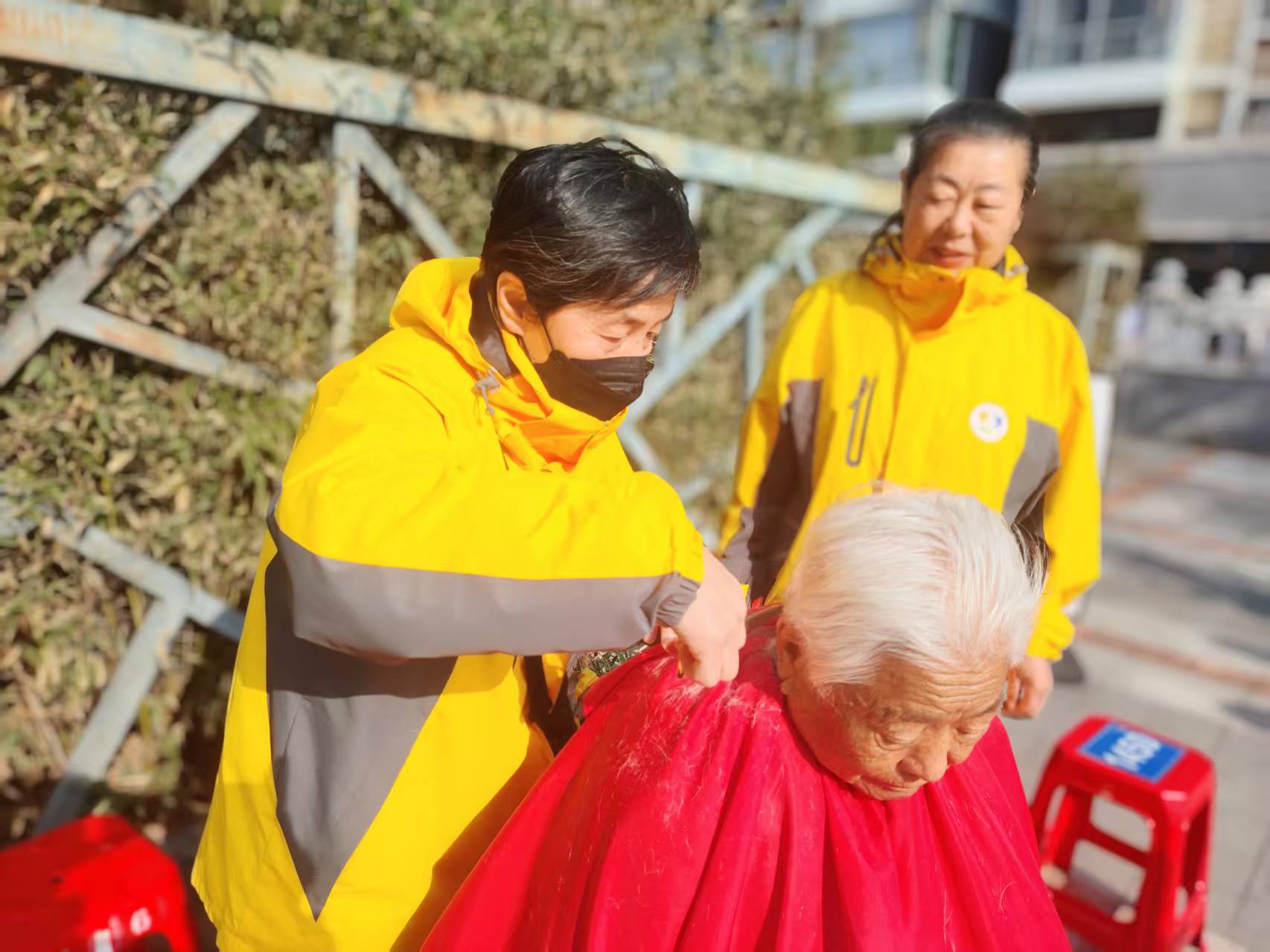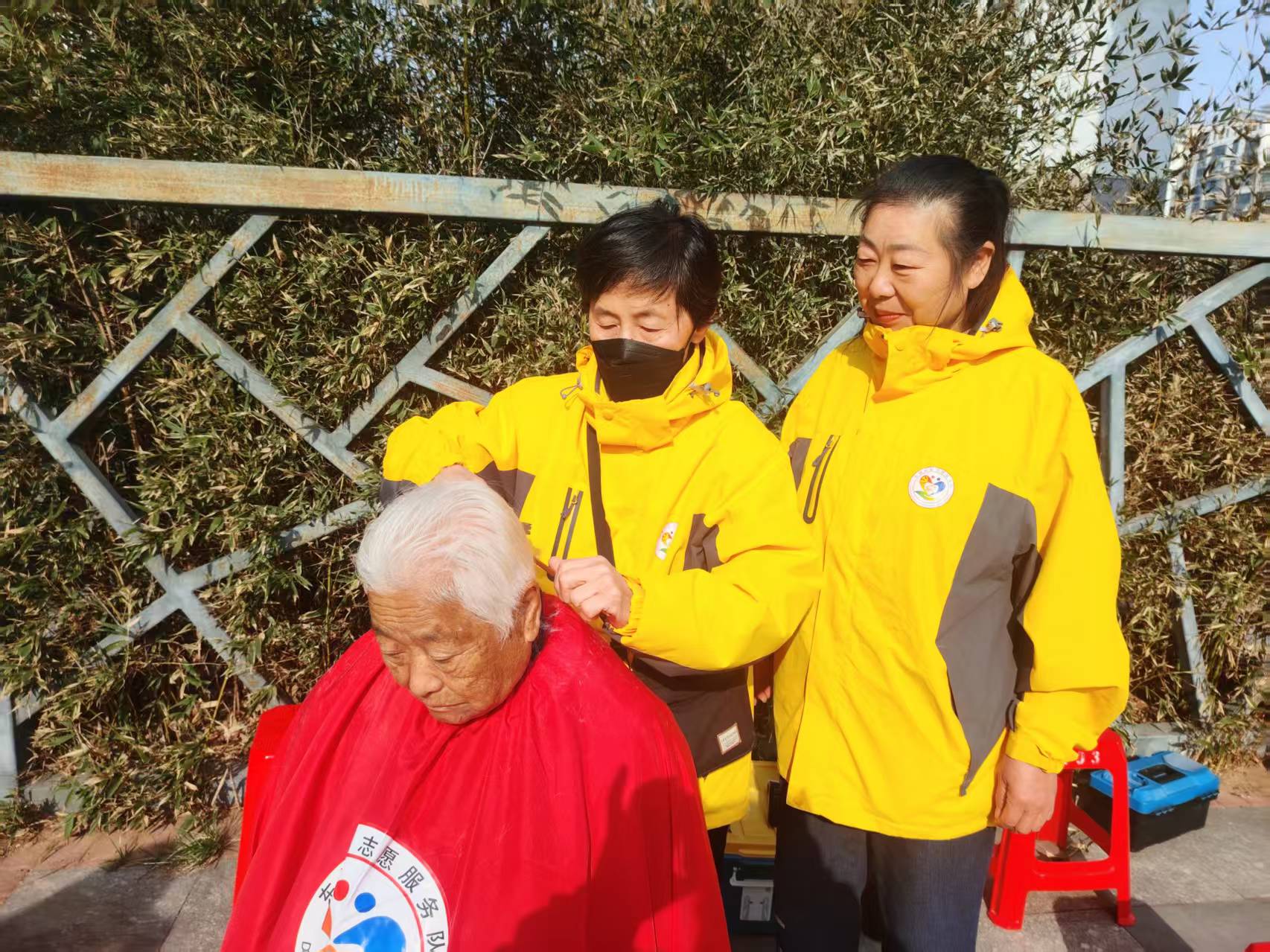 东城社区志愿服务队受黄海路社区居委会邀请,参加社区睦邻大集的爱心义剪服务,为前来公益大集的老人免费理发。