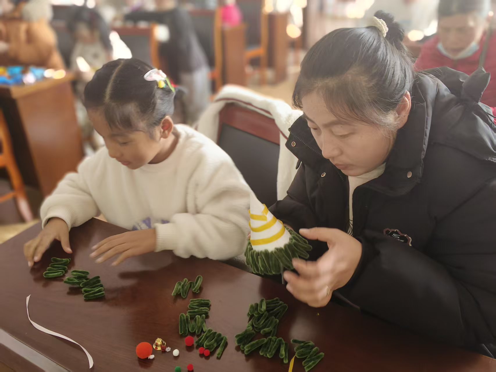 在圣诞节来临之际,富甲社区在活动室组织辖区儿童和家长,开展制作圣诞树手工亲子活动,增进亲子之间的关系。