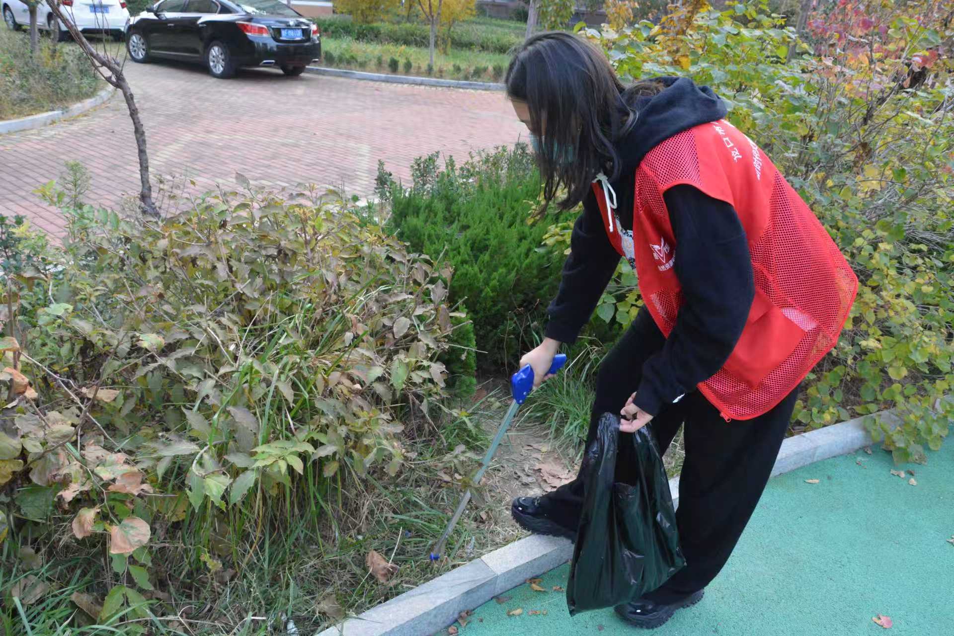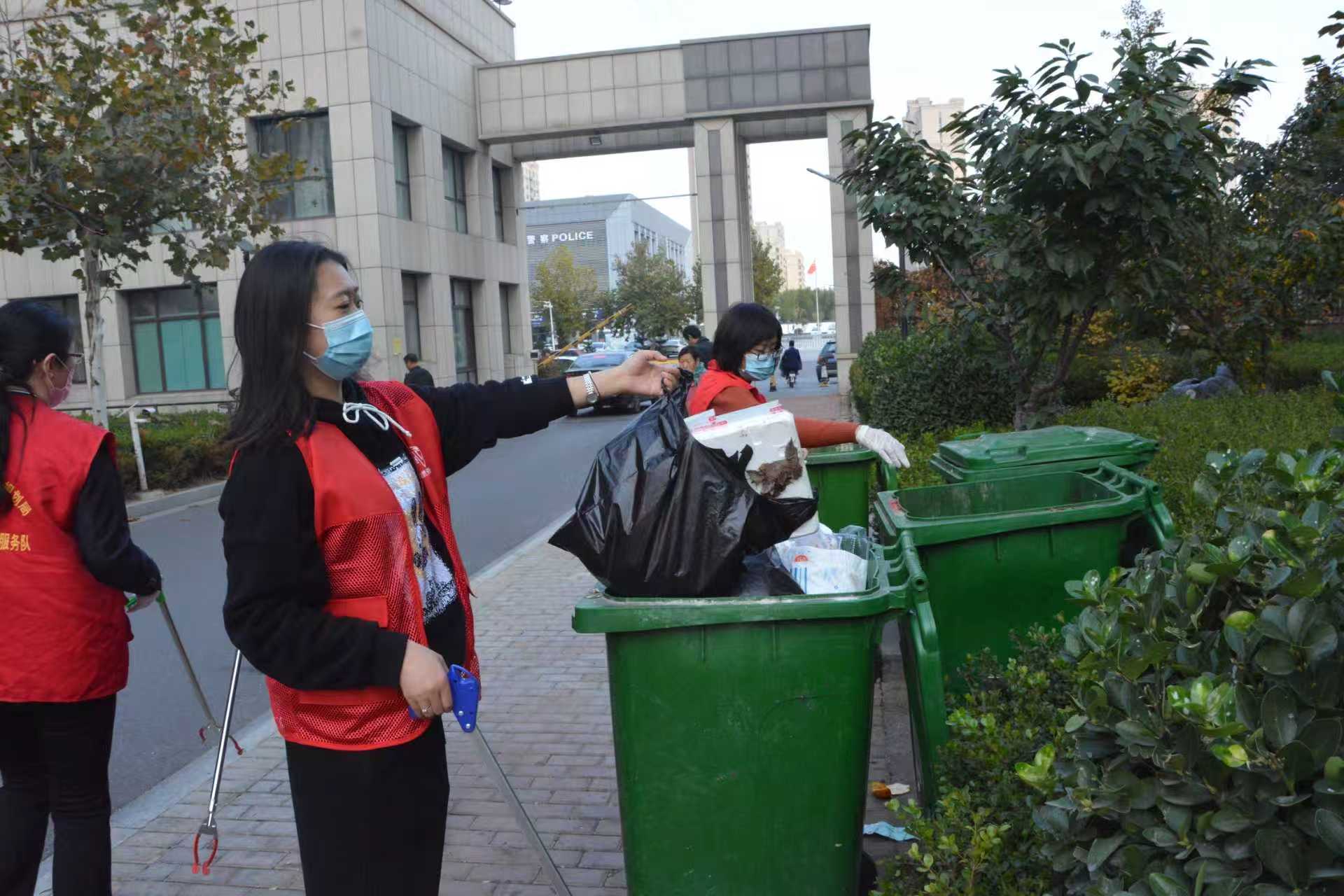 “多彩自然”志愿服务队走上街头开展志愿服务活动,志愿者们身着红色马甲,对道路和小区周围的环境进行卫生清理工作,为创建文明典范城市添砖加瓦