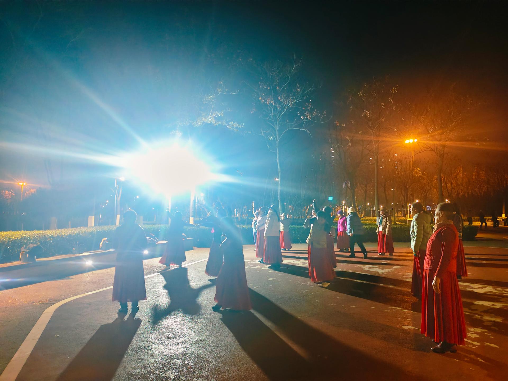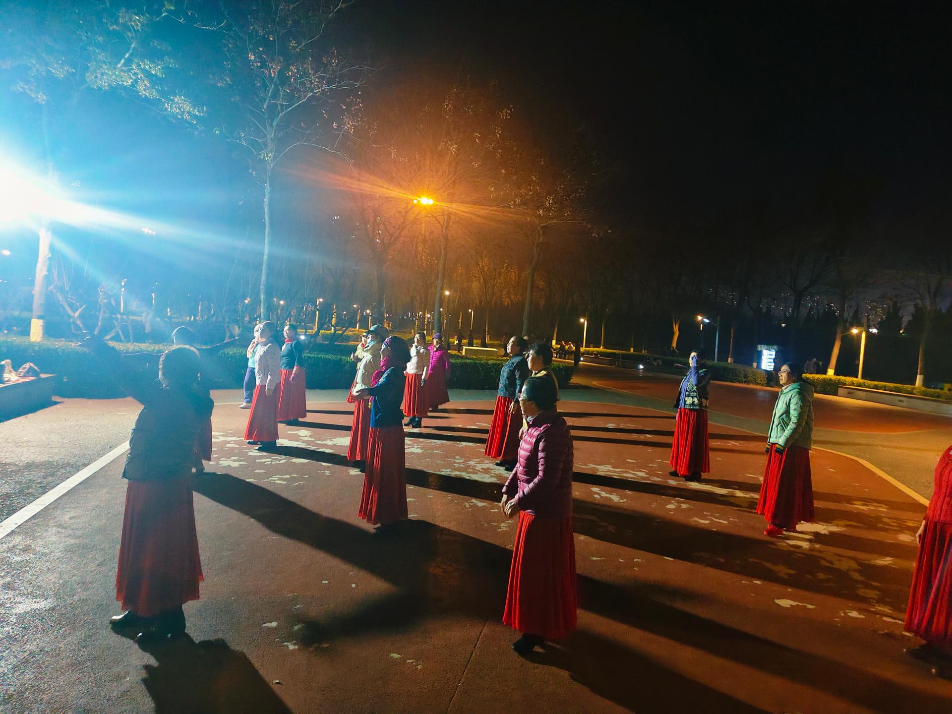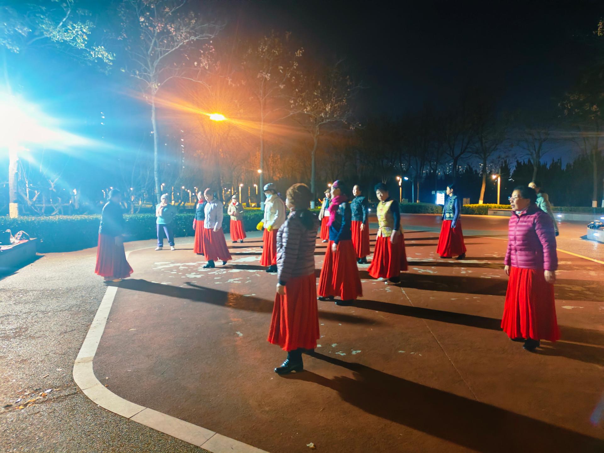 龙口市雪莲花志愿服务队在黄县林苑组织义务教授广场舞,大家在老师的指导下练习舞蹈《为何不能相逢》《打酸枣》