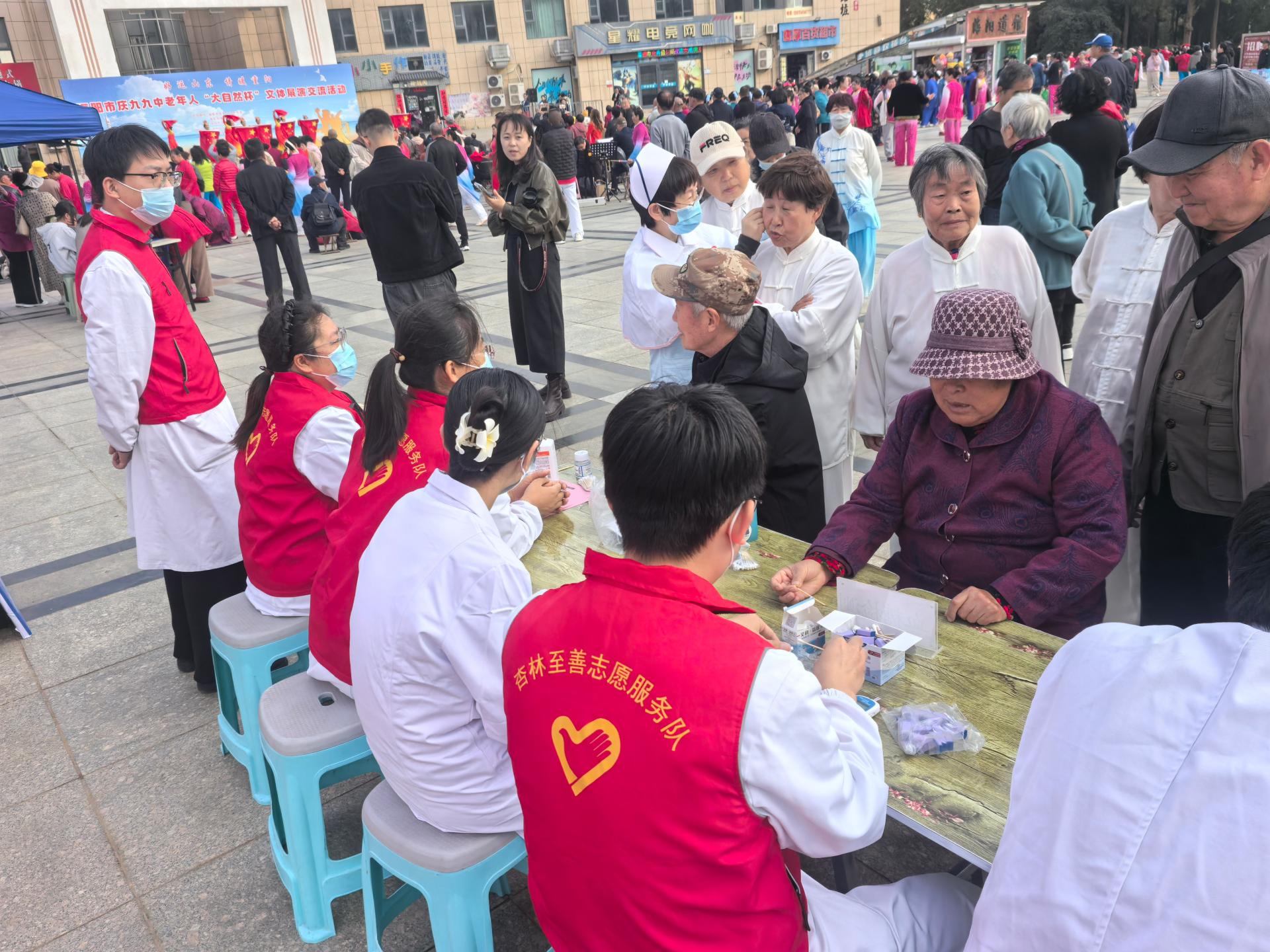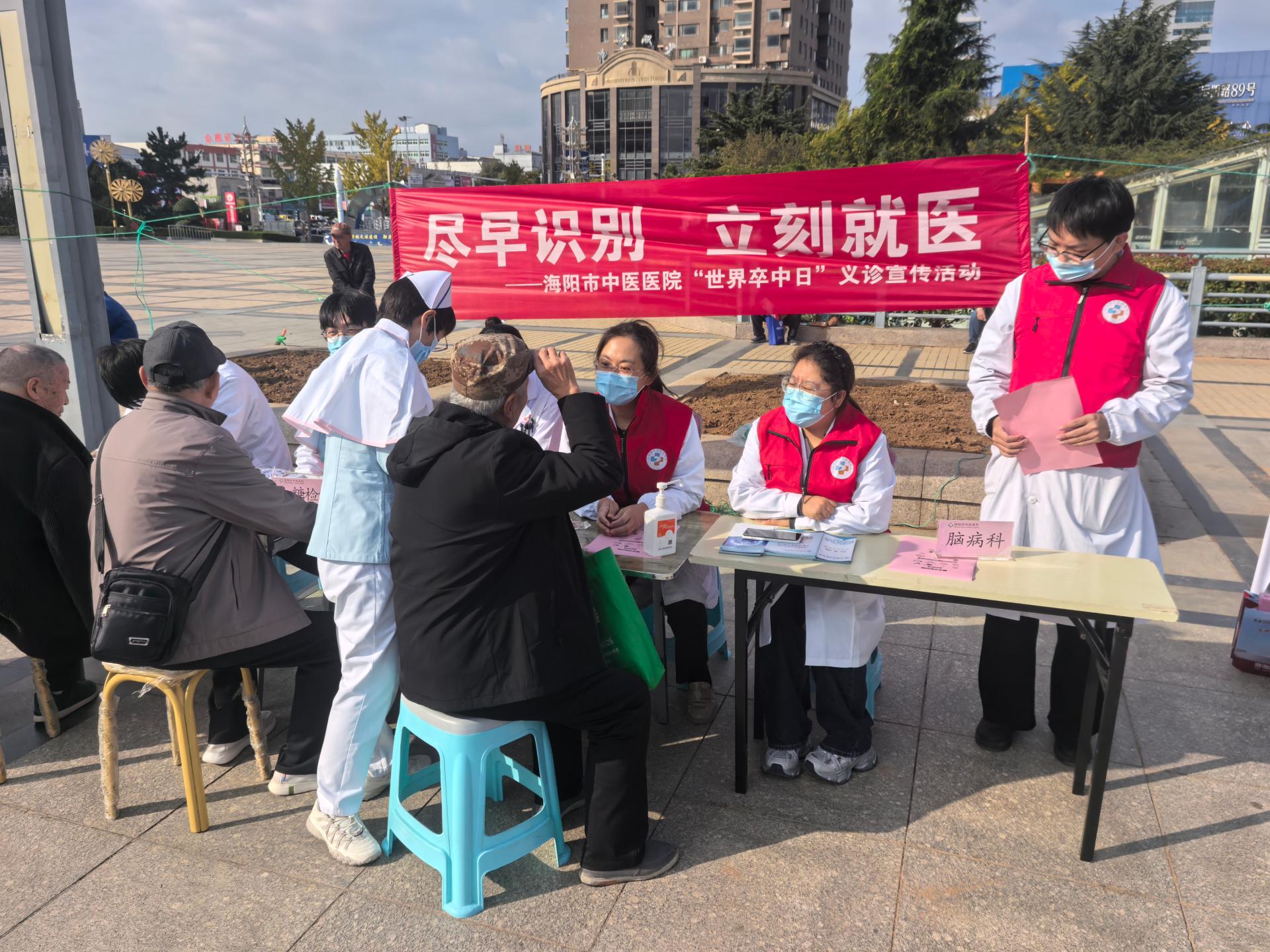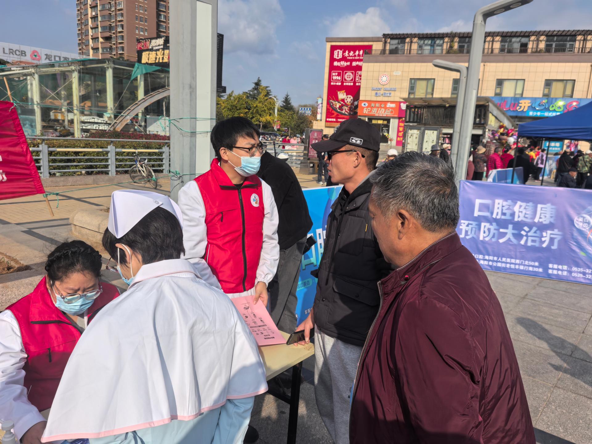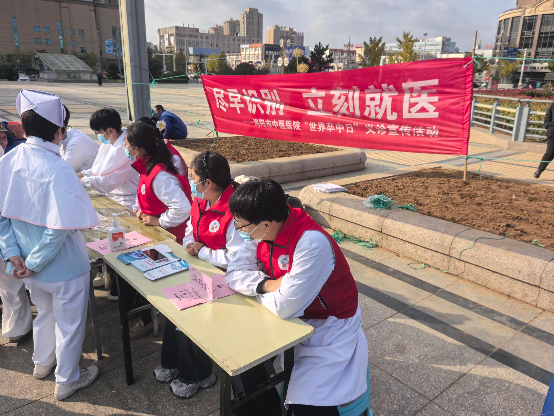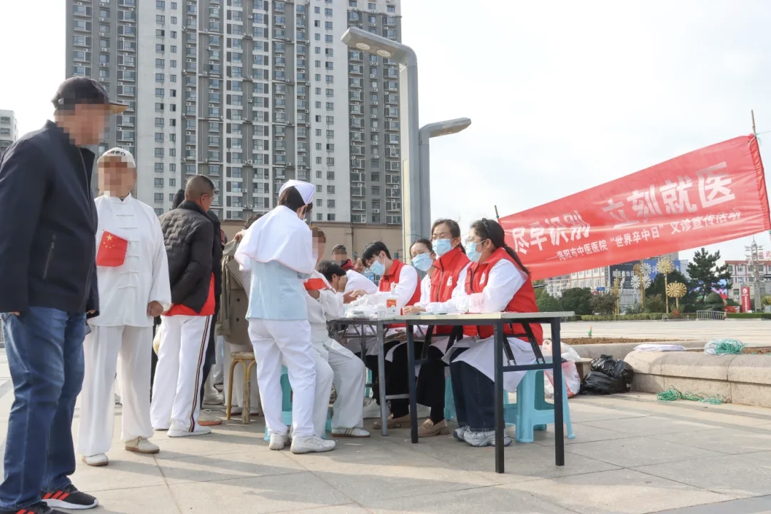 海阳市中医医院至善服务队组织脑病科大夫护士到新元广场举行世界脑卒中日活动,为居民提供测血压、测血糖服务