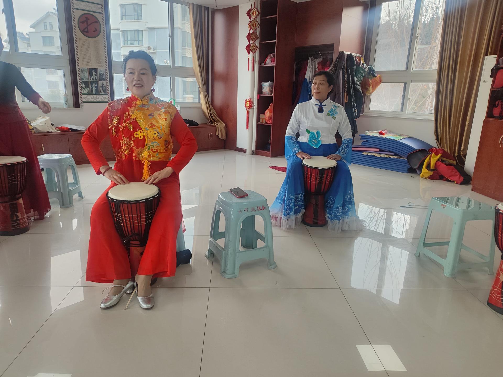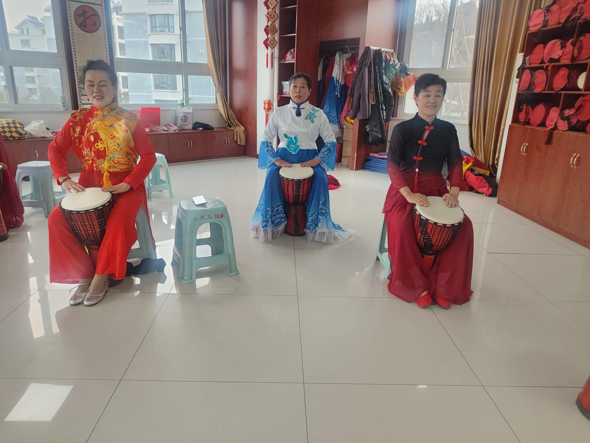 紫荆山街道杏花苑社区开展为社会公共需要服务,社区内喜欢非洲鼓的居民到社区来上公益课,在志愿者老师的指导下学习。