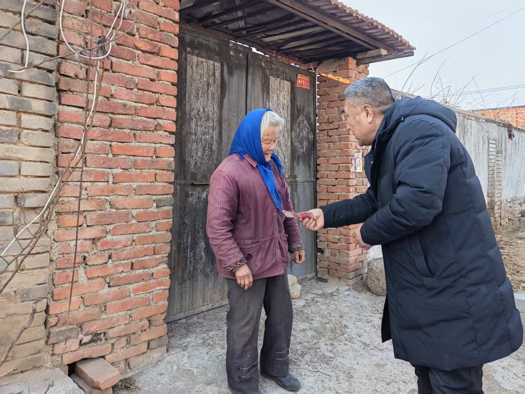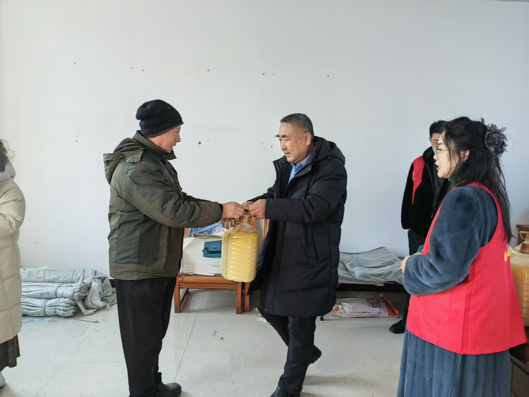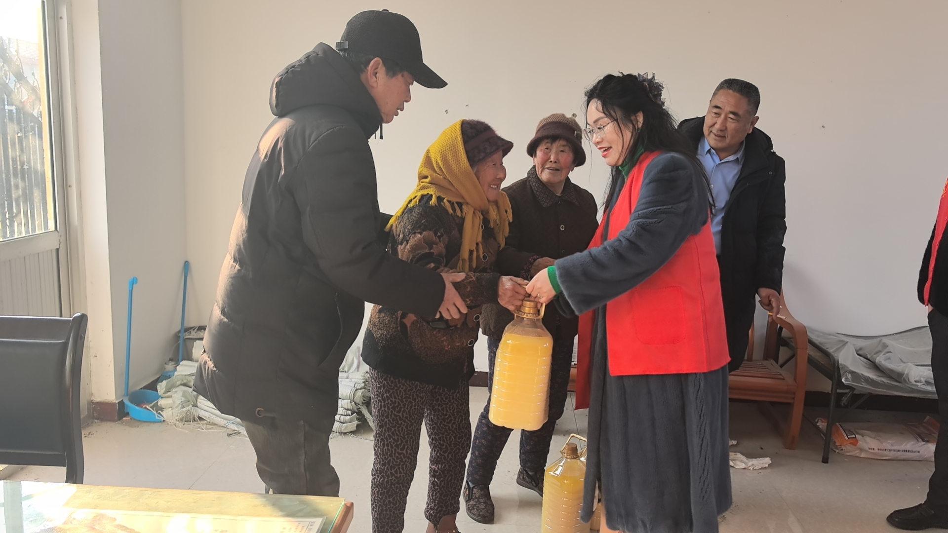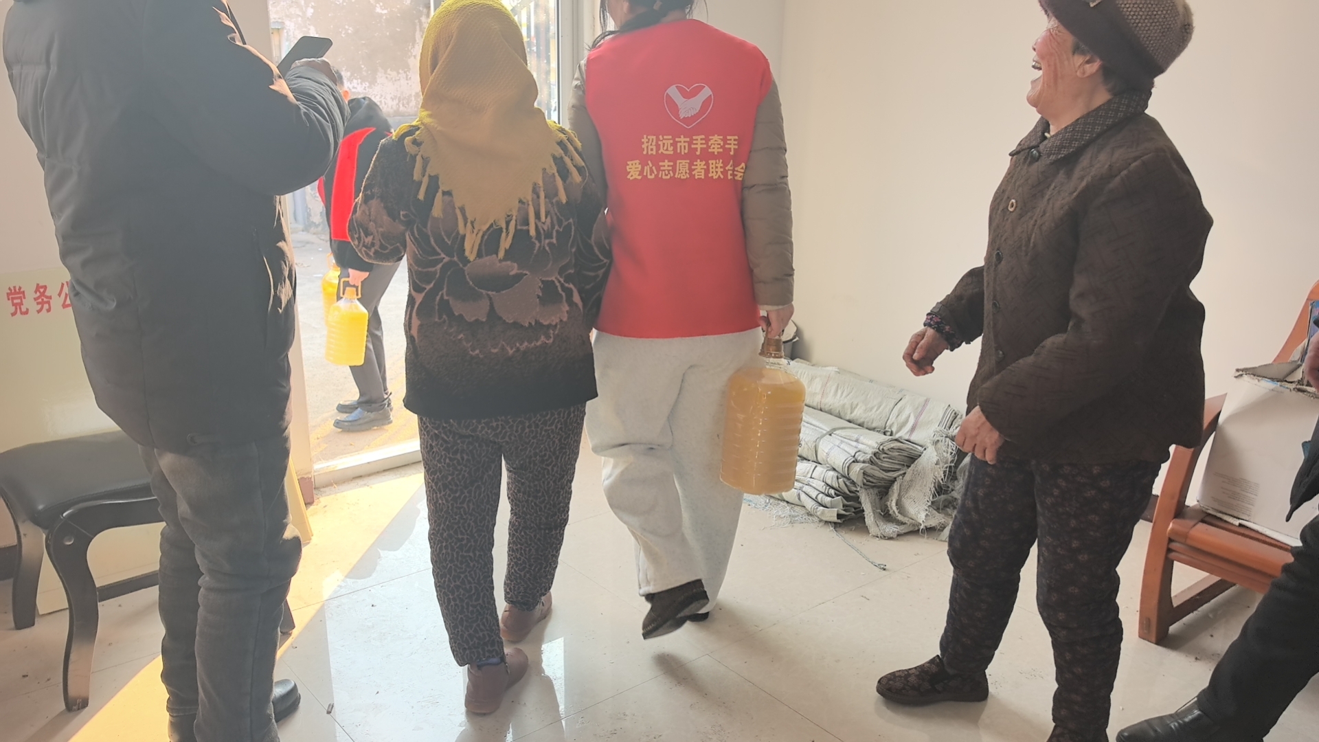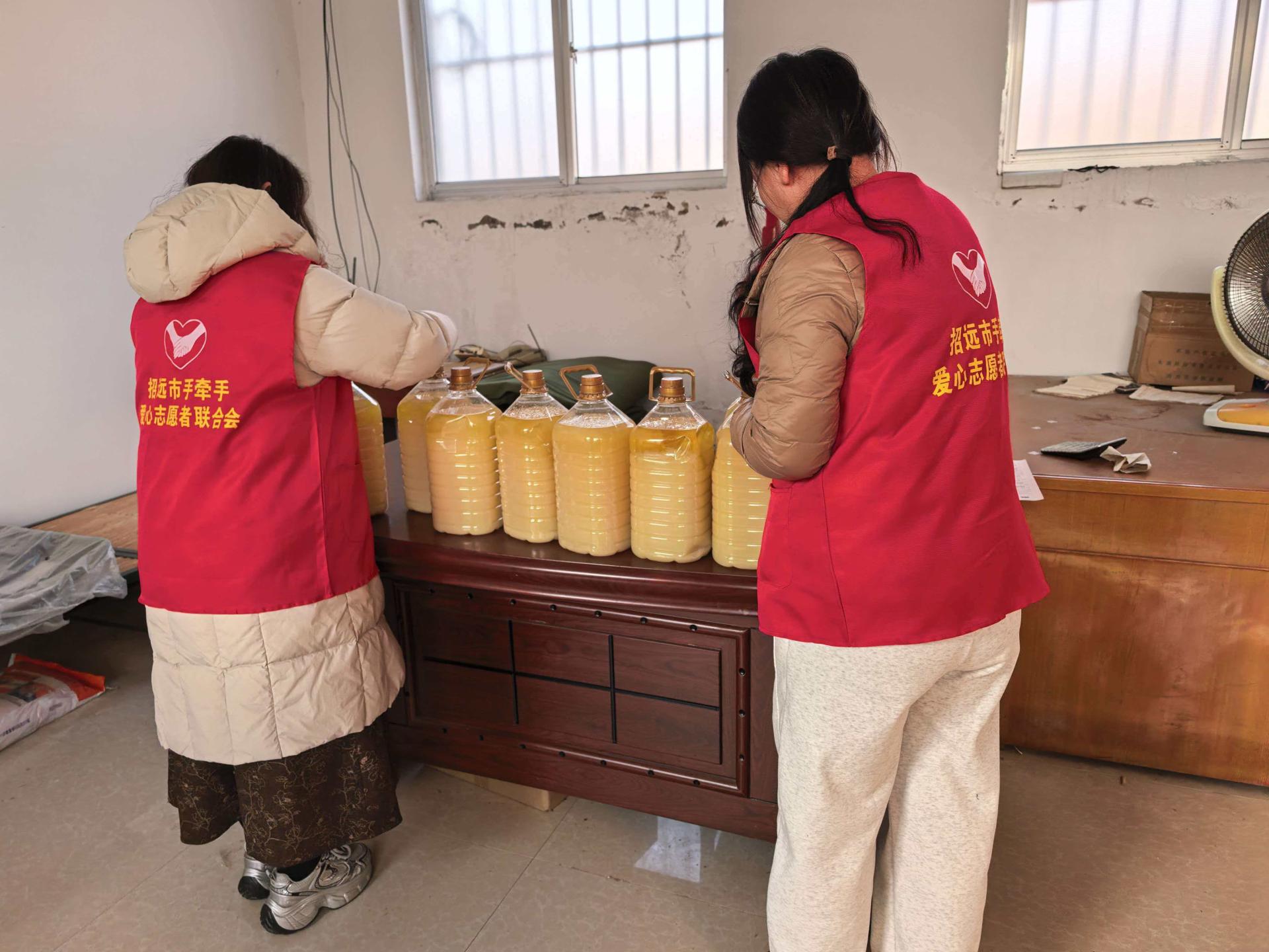 招远市手牵手爱心志愿者联合会携手爱心企业家张总,为招远市毕郭镇毕郭三村,为村里行动不便的老人,送去爱心物资,每家20斤花生油,并为一位失明老人送去二百元善款