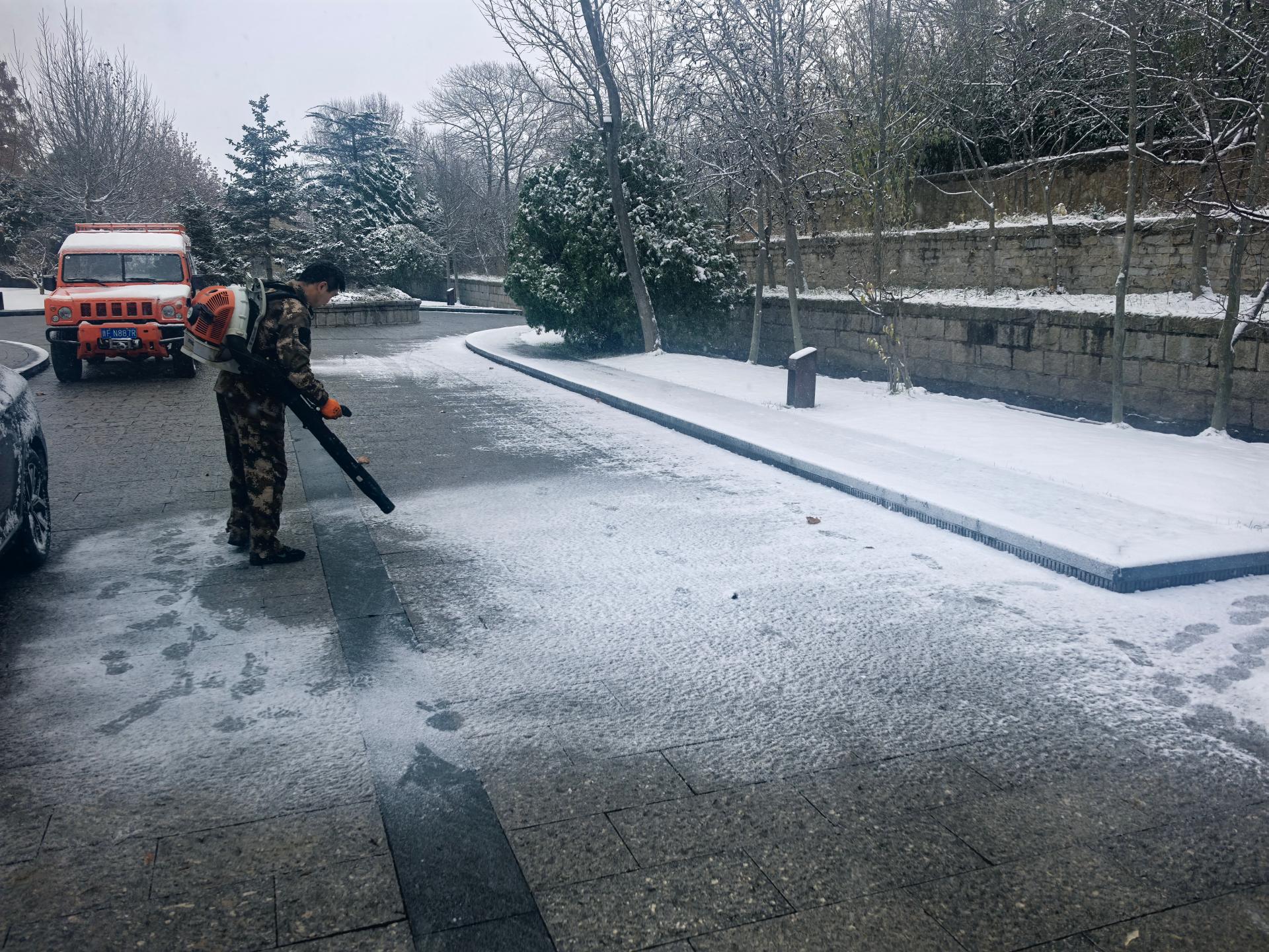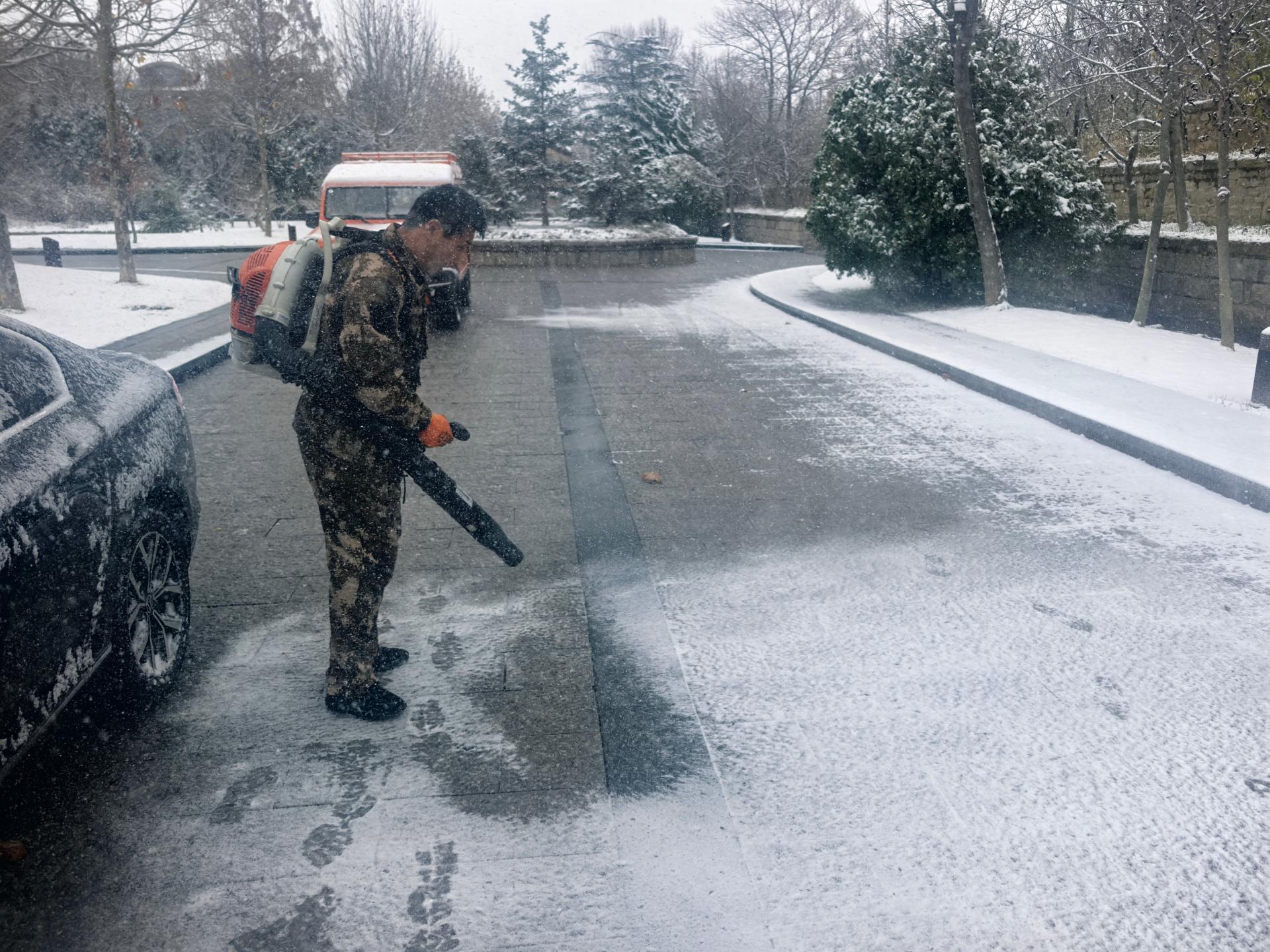 2025年12月3日昆嵛山林场应急管理科组织科员在林场范围进行积雪清扫,保障人员出行安全和环境卫生整洁。