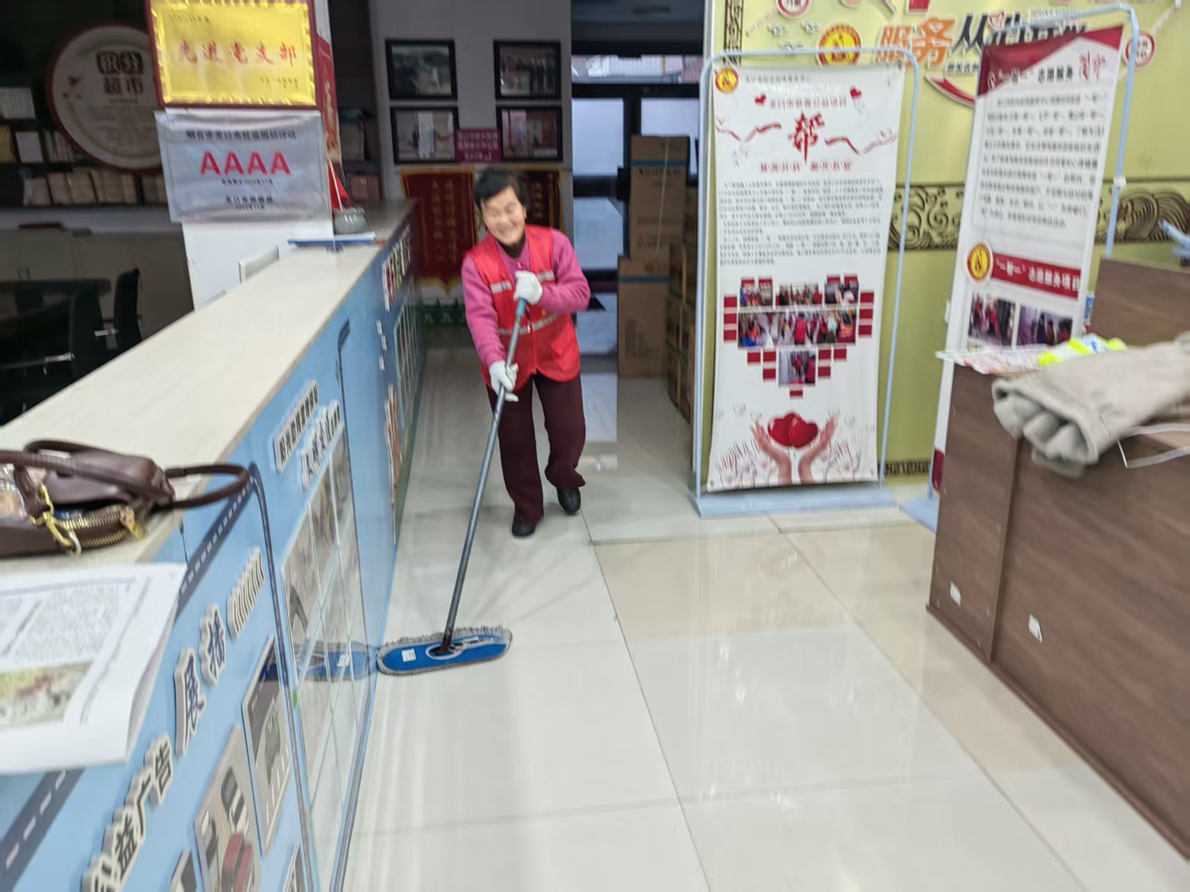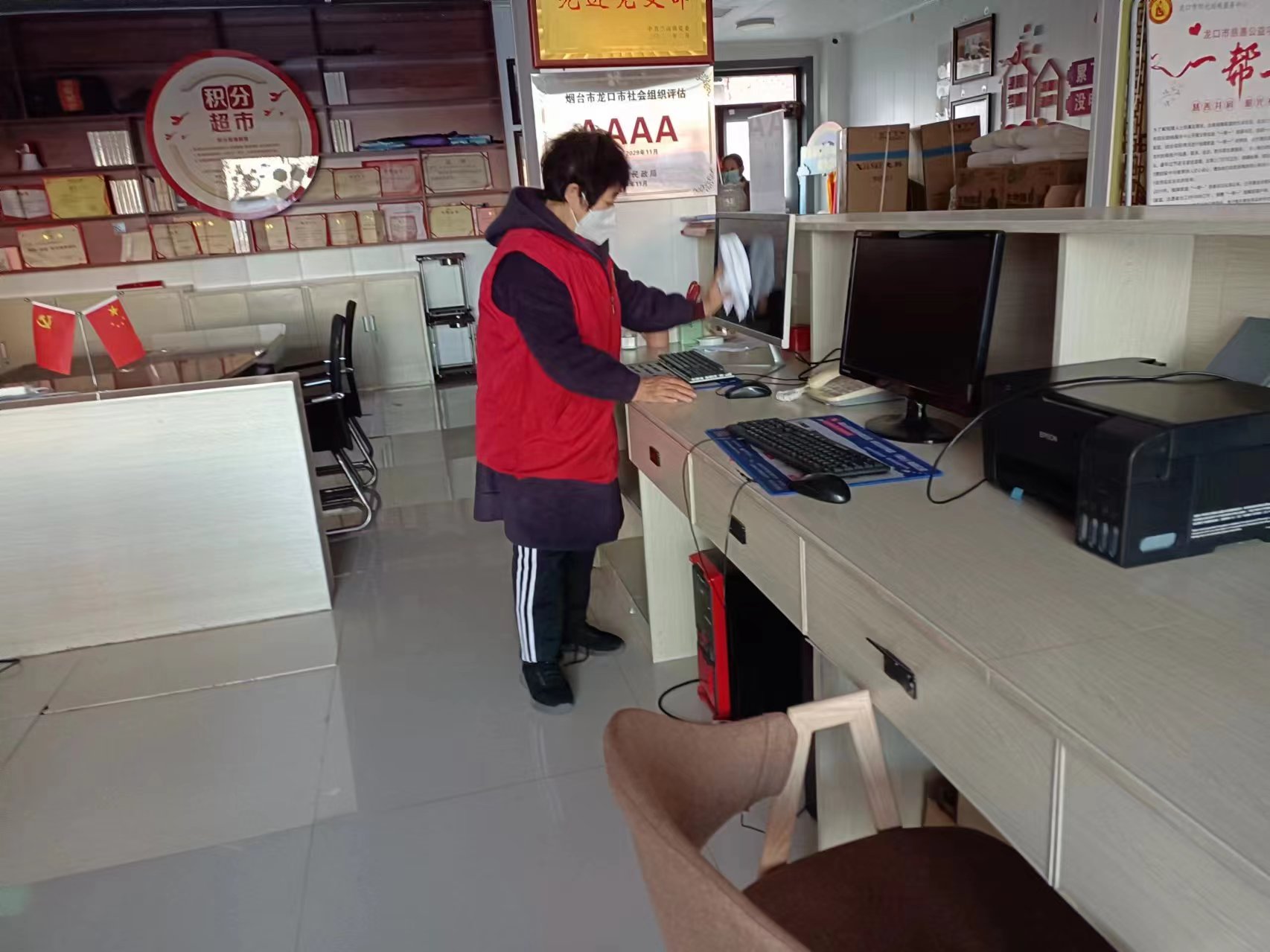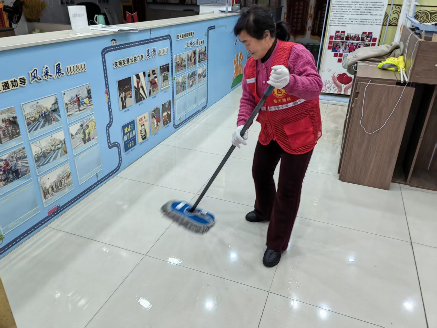 龙口市阳光助残服务中心志愿者们在阳光助残雷锋驿站开展常规值班、志愿者整理活动资料、打扫卫生、二实小护学岗、公益排练等志愿活动