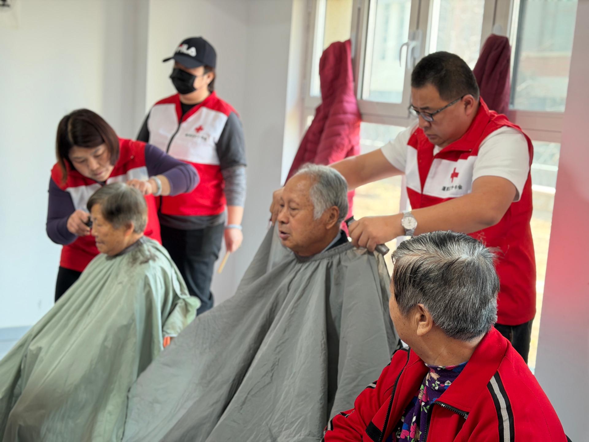 慈善总会九久义工队,应邀到登洲府邸为60岁以上老人,残疾人士义务理发活动,穿九久义工马甲,骑电动车一定要戴头盔,路上注意安全。