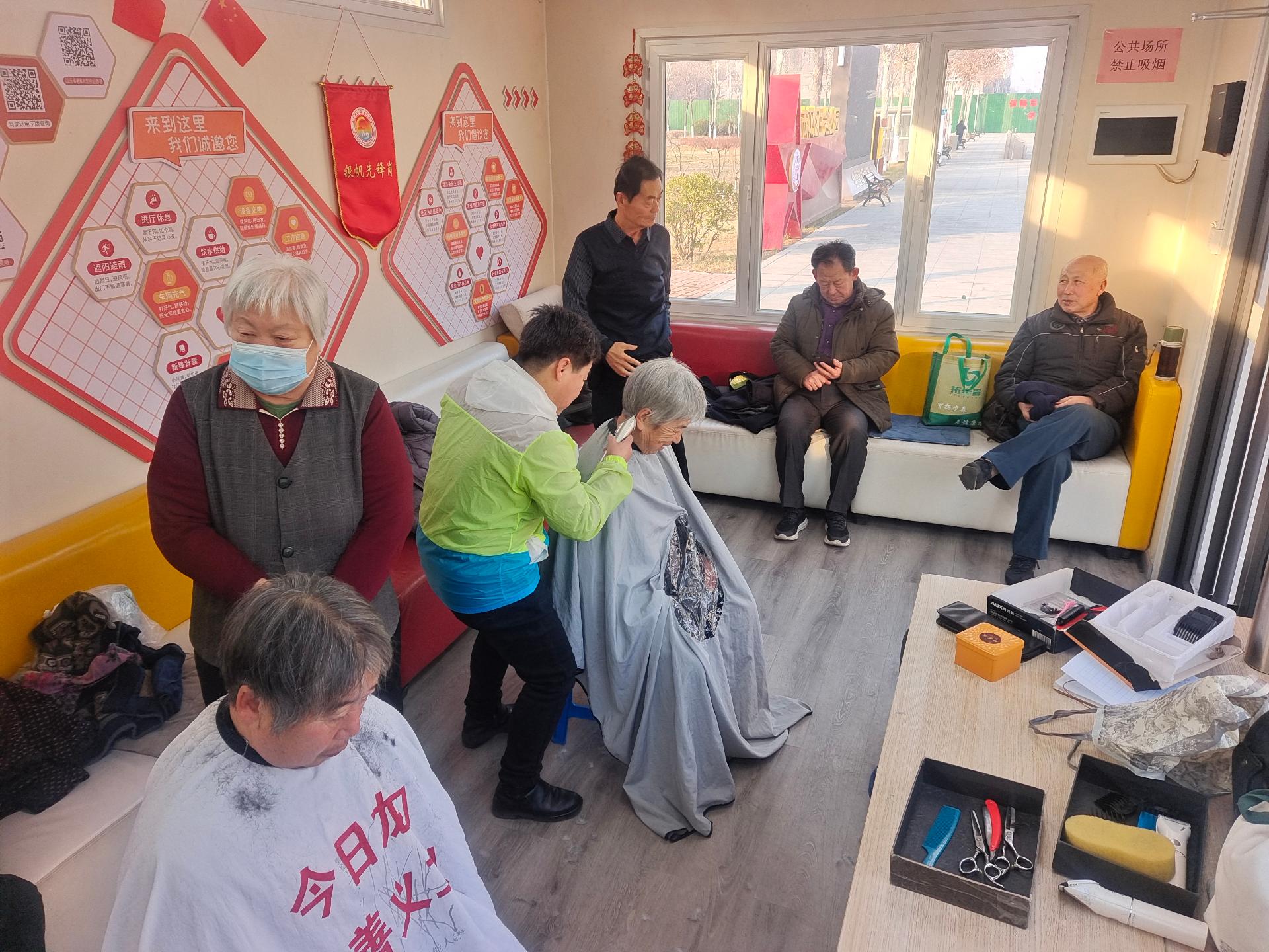 今日龙口慈善义工队的志愿者常规每个周一到林苑北门城市芯先锋驿站为社区老人义务理发,志愿者们细心的为社区的居民理发。