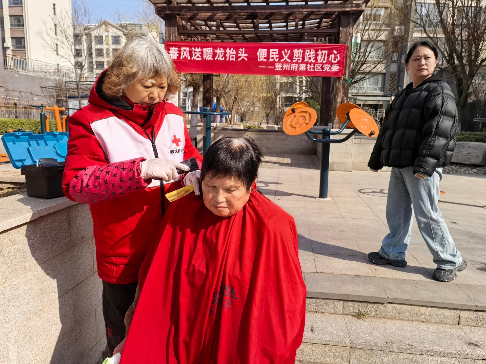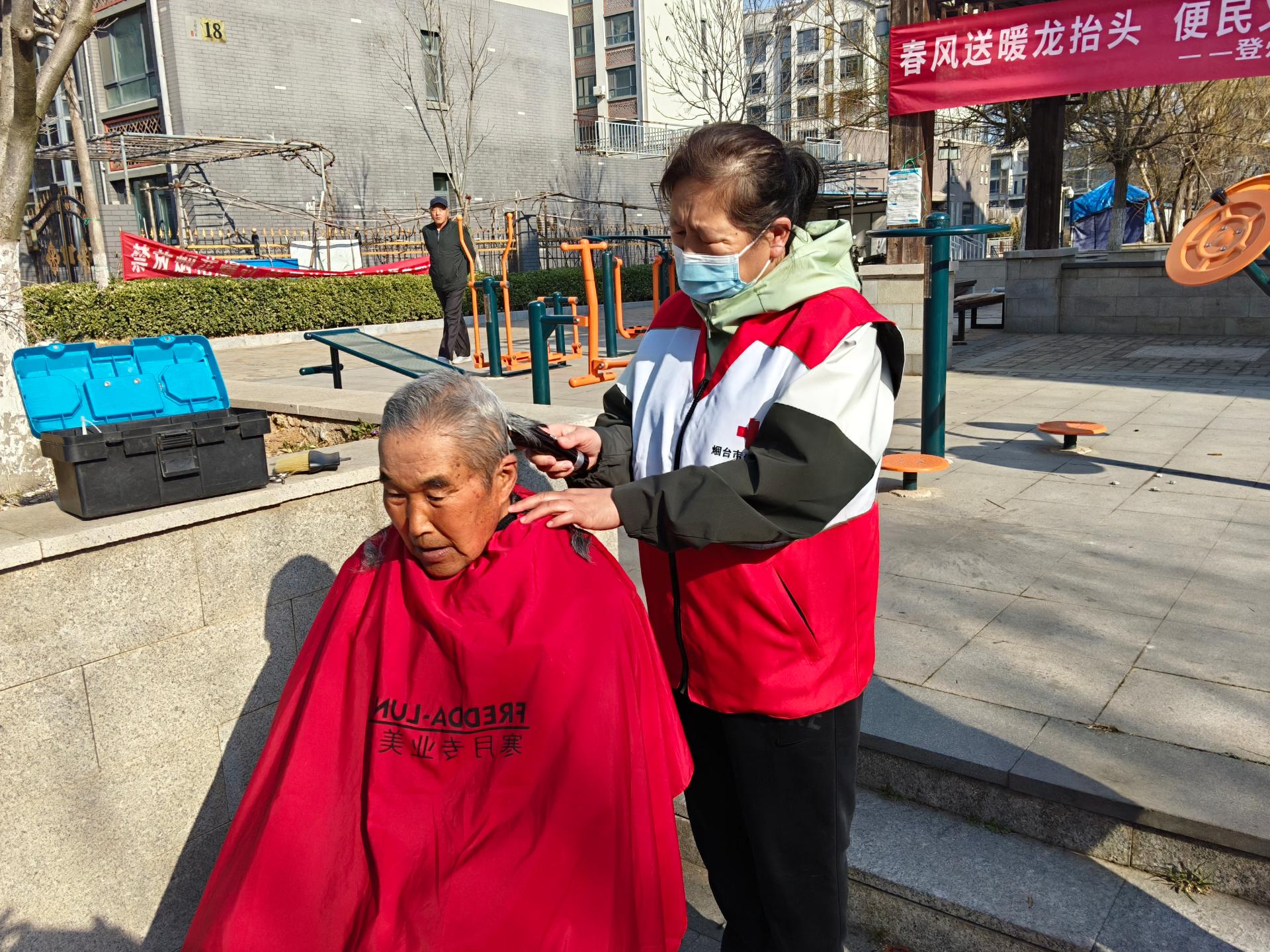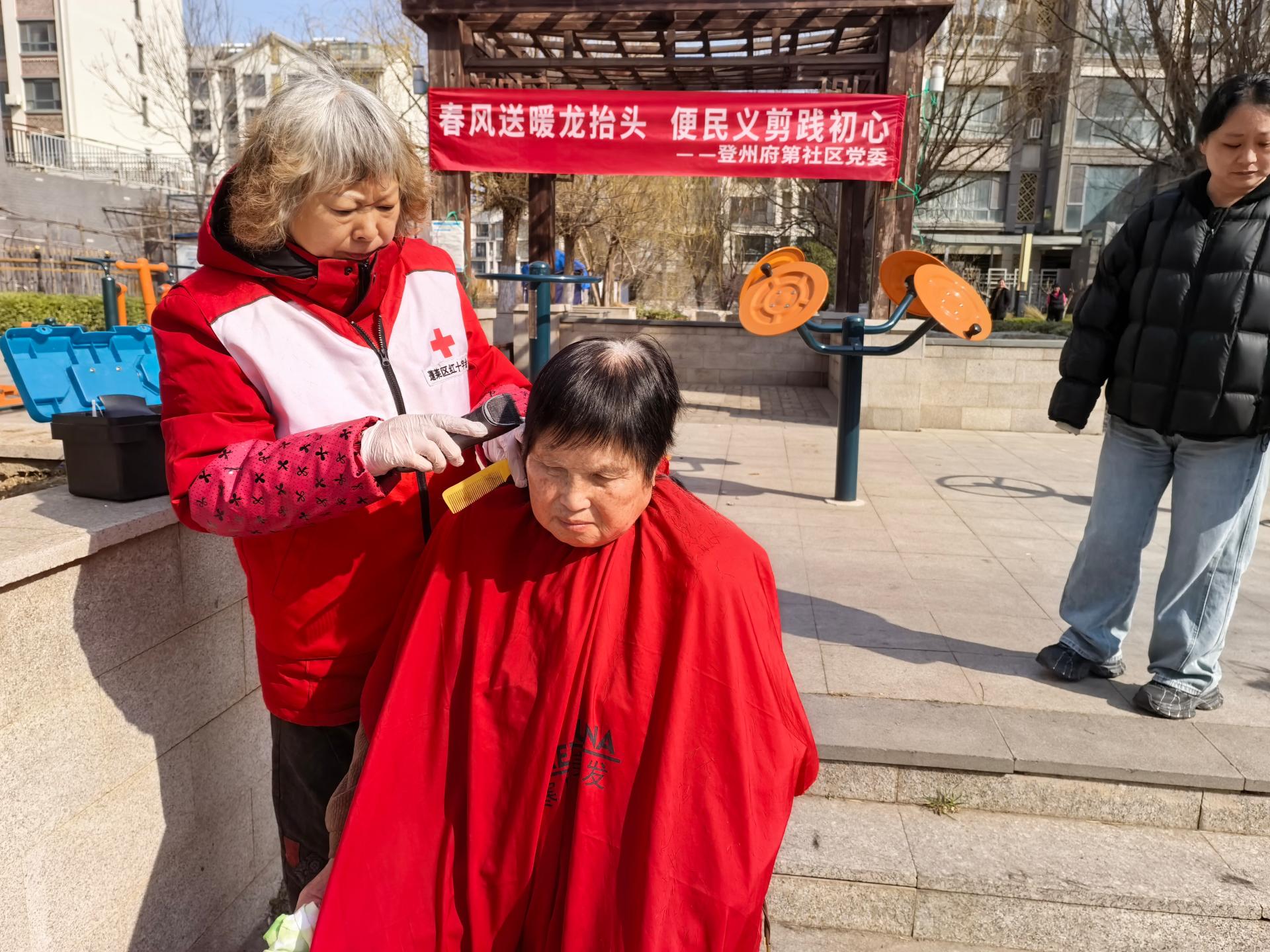 慈善总会九久义工队,应邀走进登洲府邸社区为六十岁以上老人及残疾人士义务理发活动。穿九久义工马甲,路上注意安全。