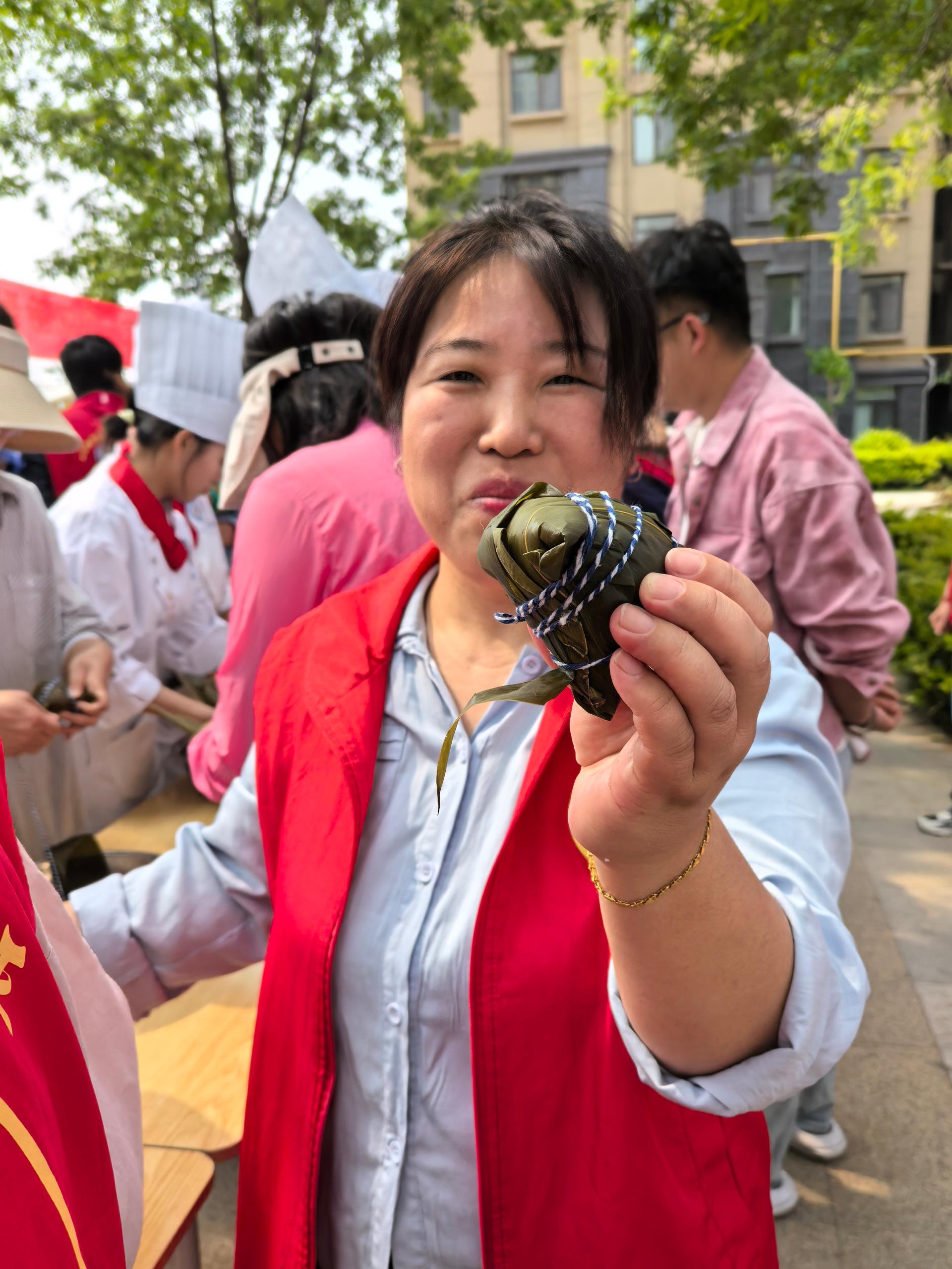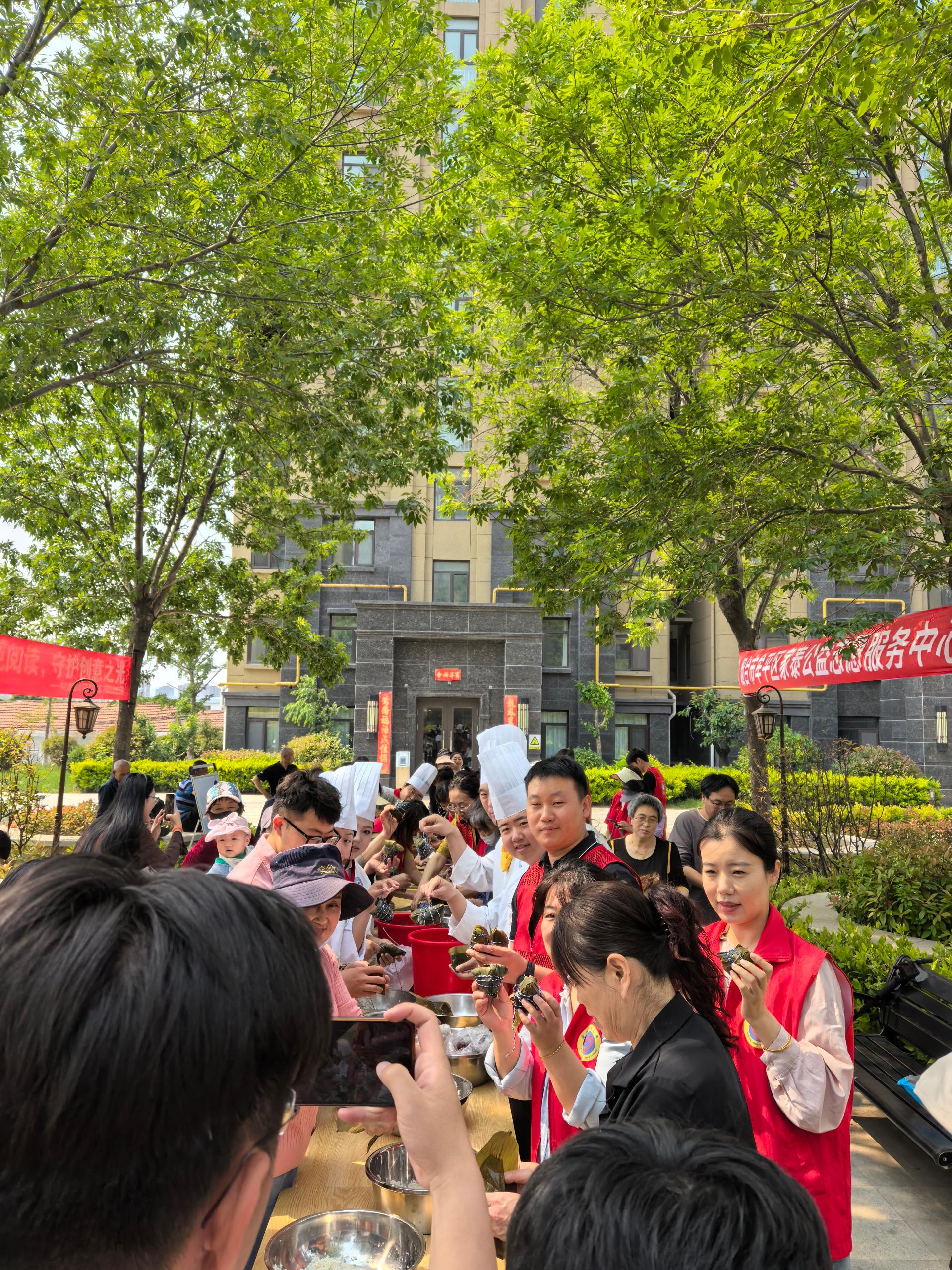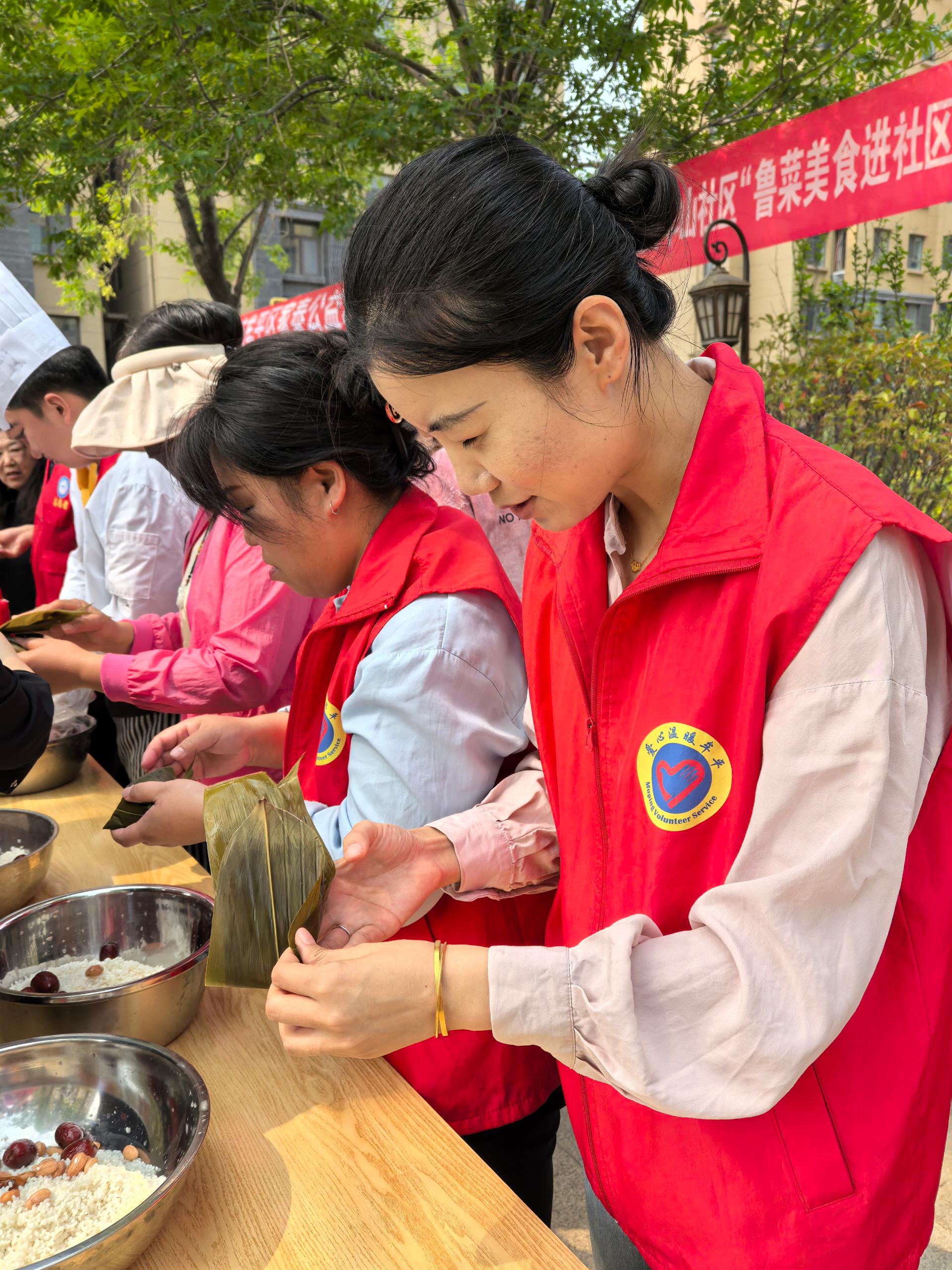 志愿者到牟山社区翡翠康城小区开展传承鲁菜文化,构建健康生活志愿服务活动,与社区居民一起包粽子,喜迎端午节。