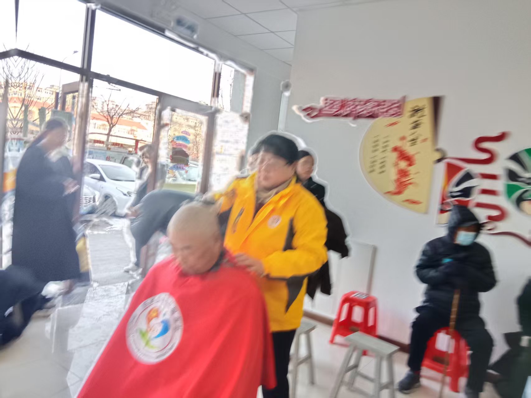 东城社区志愿服务队受黄海路社区居委会邀请,为社区老人免费理发,并且为 腿脚不方便的老人上门服务。队友们穿马甲带工具路上注意安全