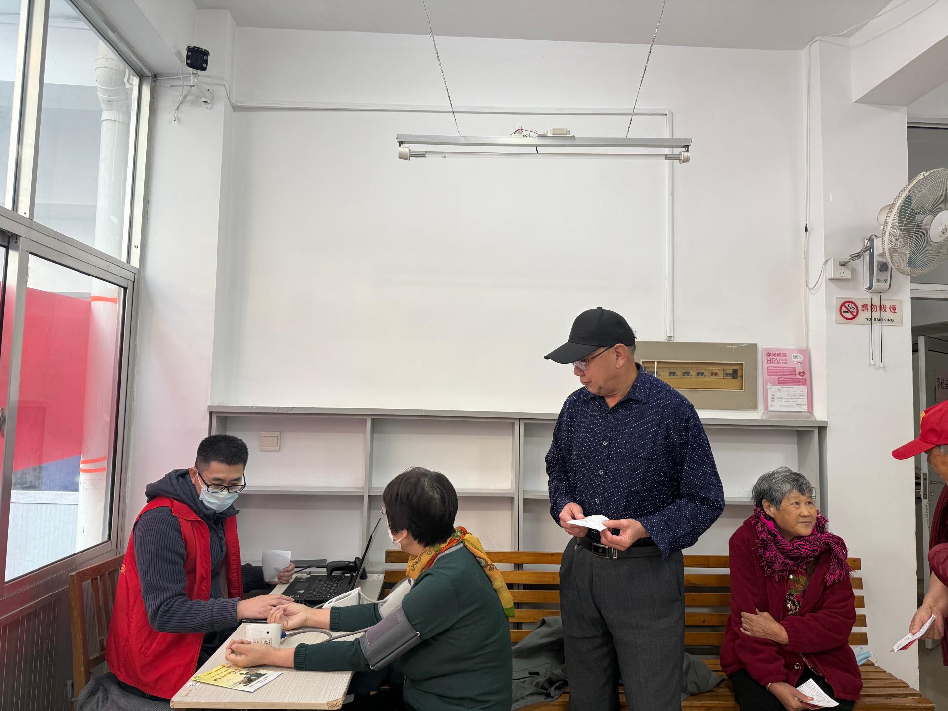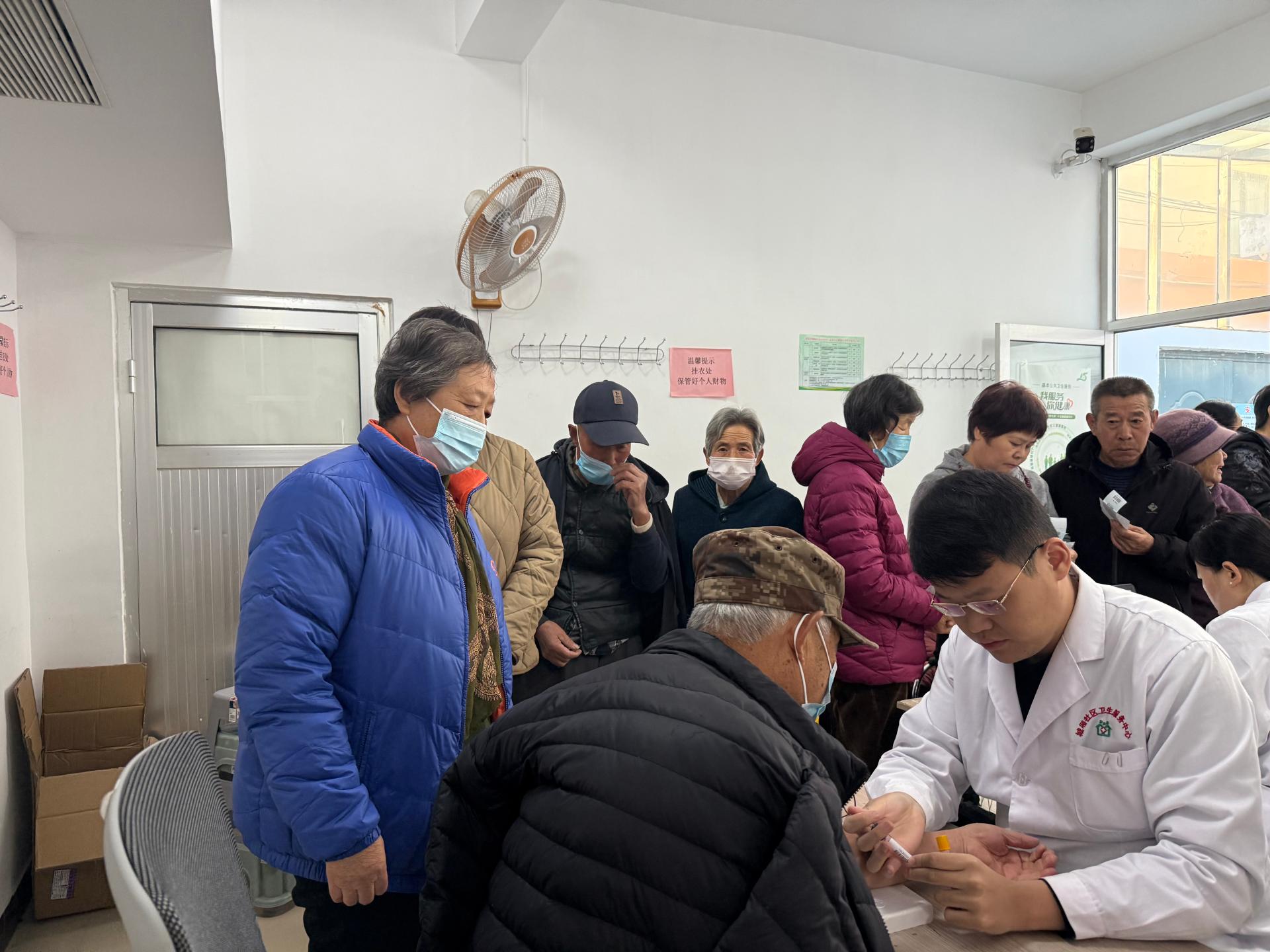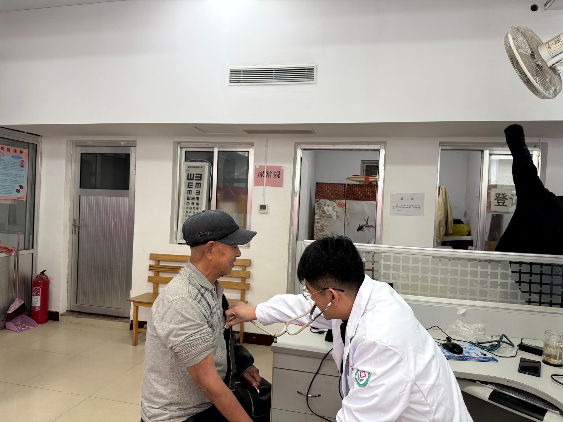 莱阳市城厢街道社区卫生服务中心为辖区的老年人进行免费测量血压、 问诊活动, 并进行健康指导。