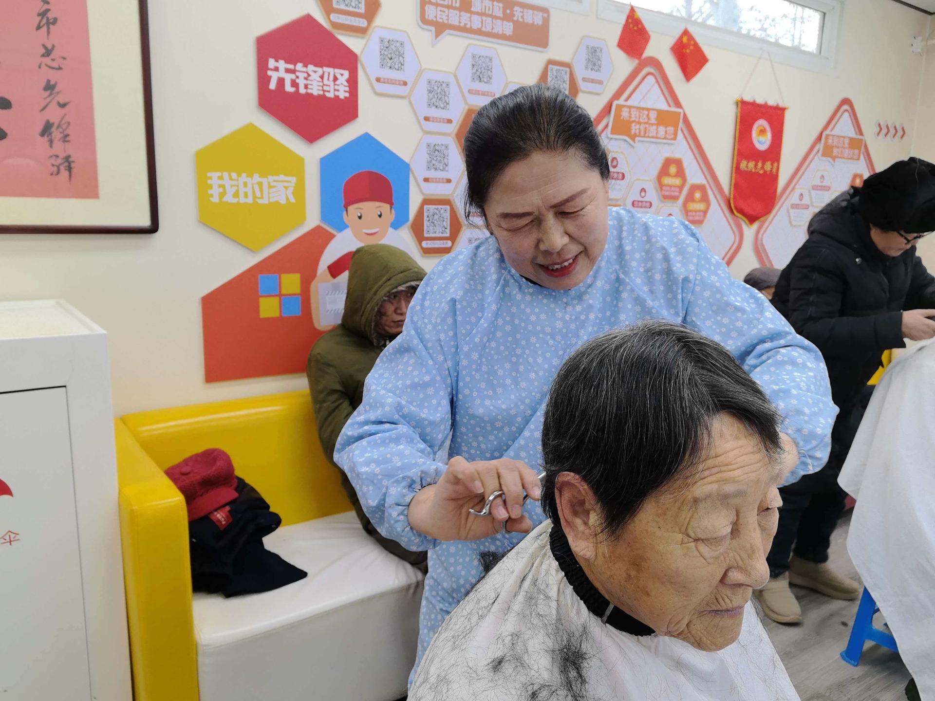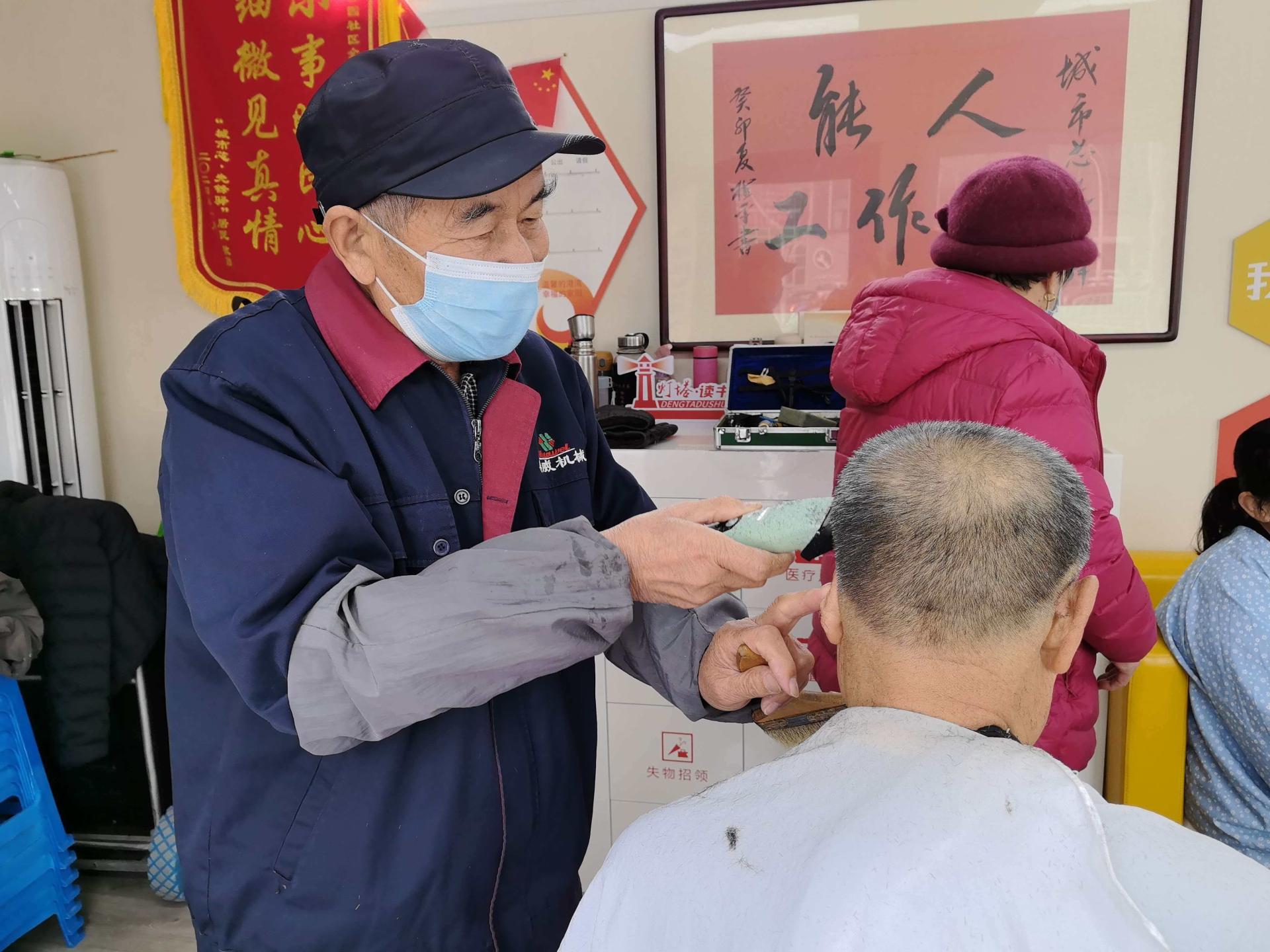 今日龙口慈善义工队的志愿者常规每个周一到林苑北门城市芯先锋驿站为社区老人义务理发,志愿者们细心的为社区的居民理发。