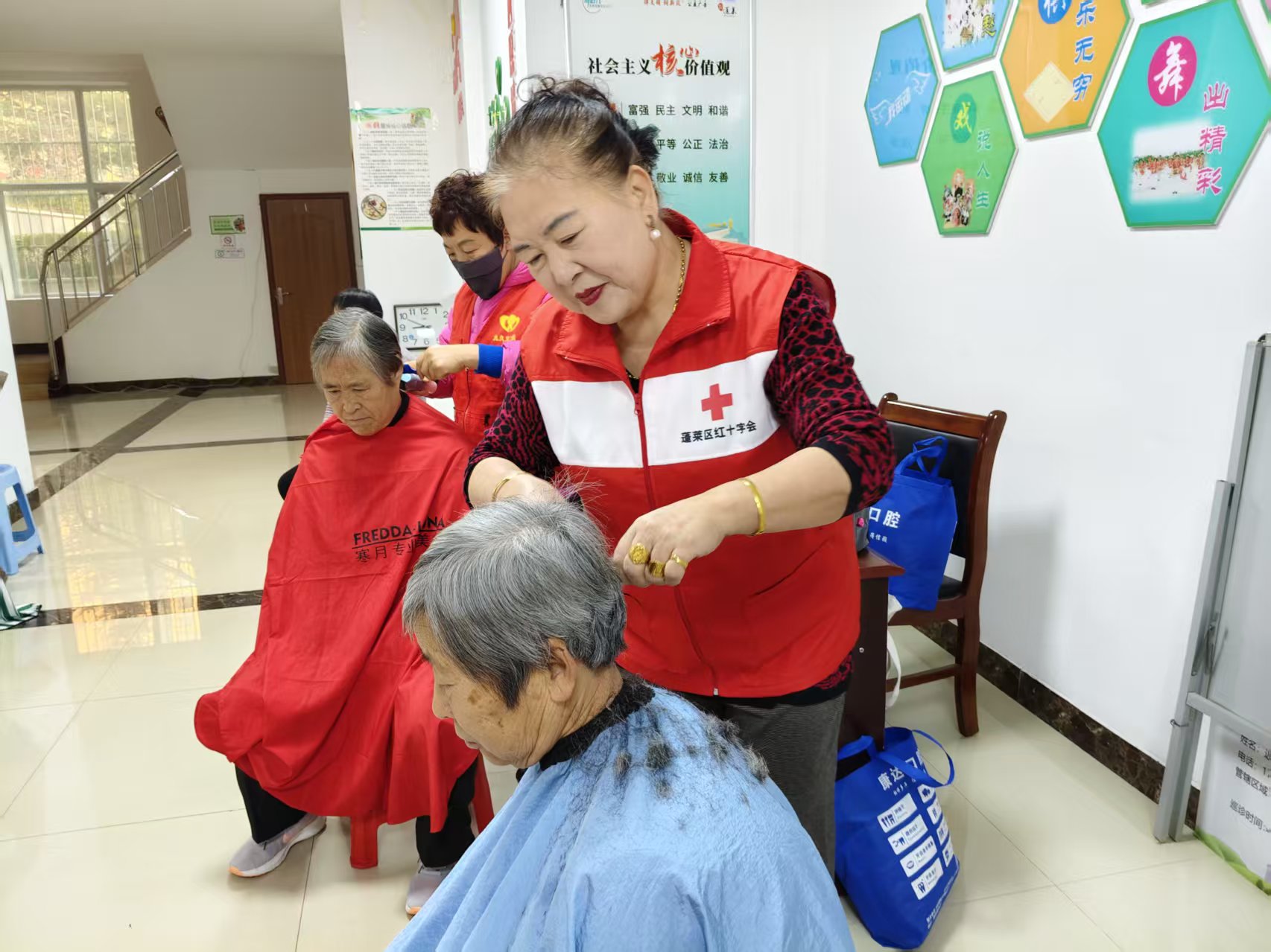 慈善总会九久义工队,应邀走进海景苑社区为六十岁以上的老人,残疾人士义务理发活动。 路上注意安全,听从队长安排。