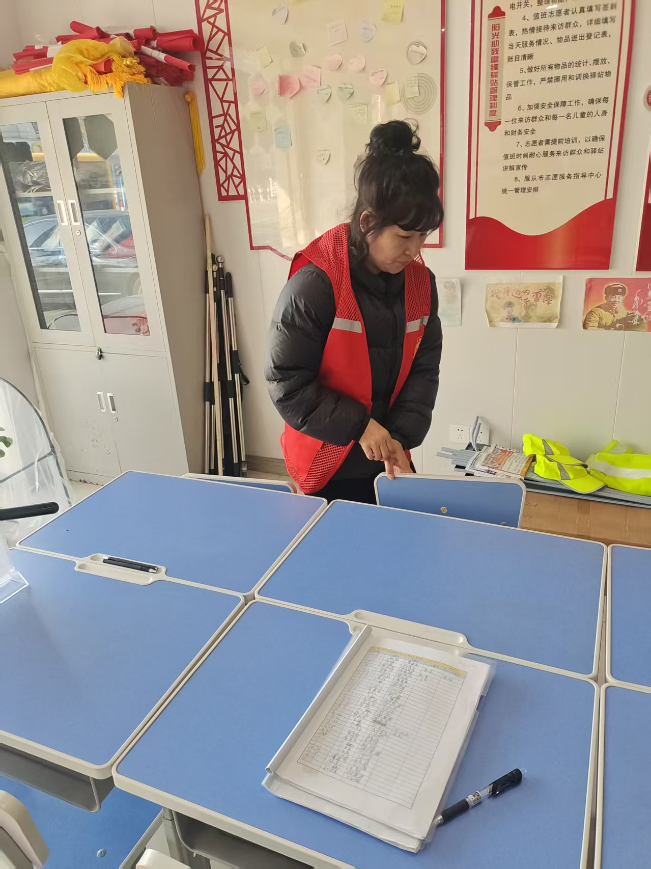 龙口市阳光助残服务中心志愿者们在阳光助残雷锋驿站开展常规值班、志愿者整理活动资料、打扫卫生、二实小护学岗、公益排练等志愿活动