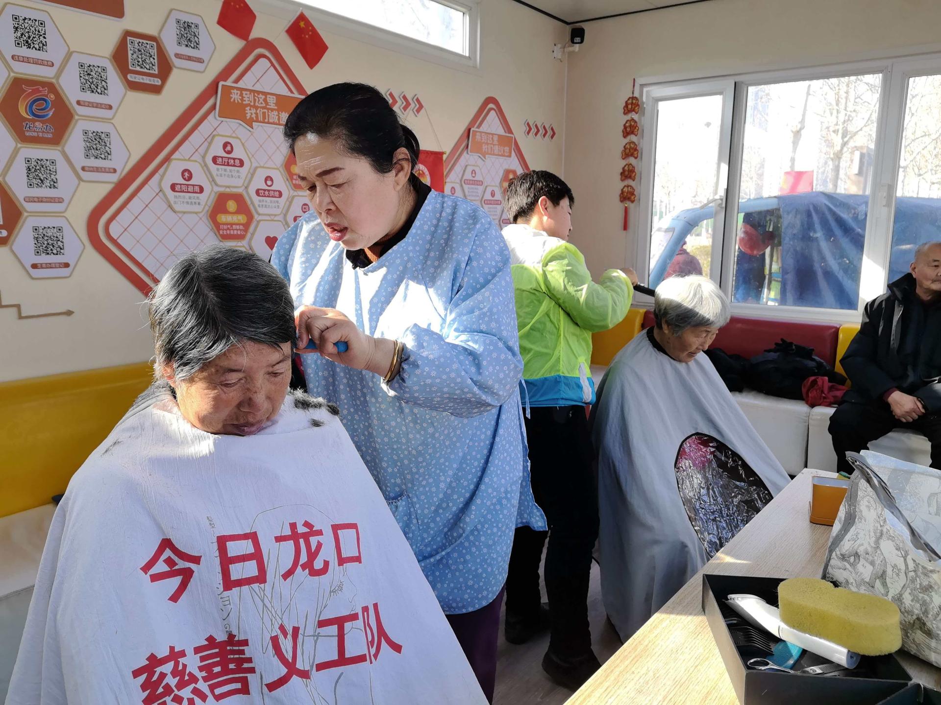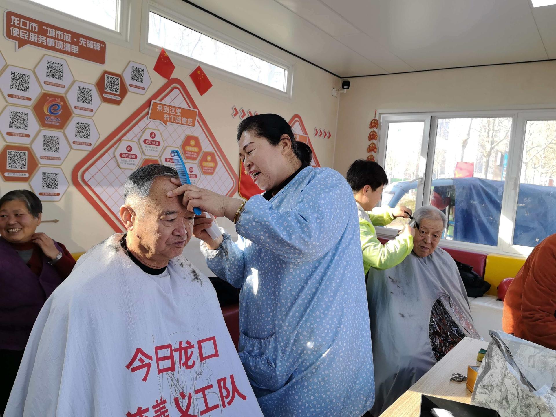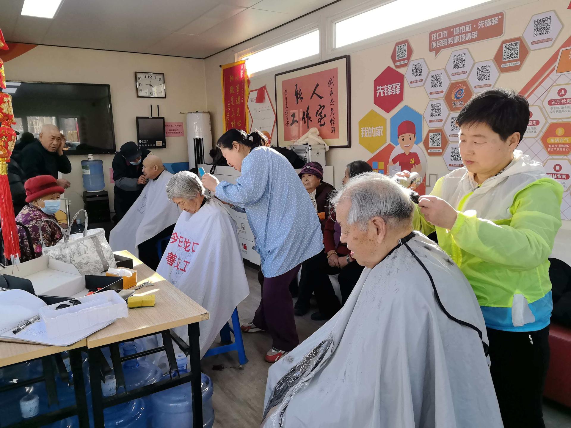 今日龙口慈善义工队的志愿者常规每个周一到林苑北门城市芯先锋驿站为社区老人义务理发,志愿者们细心的为社区的居民理发。