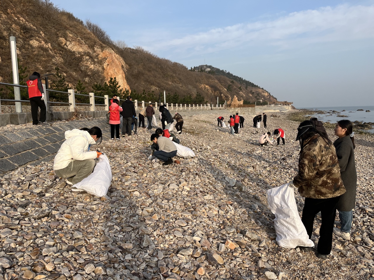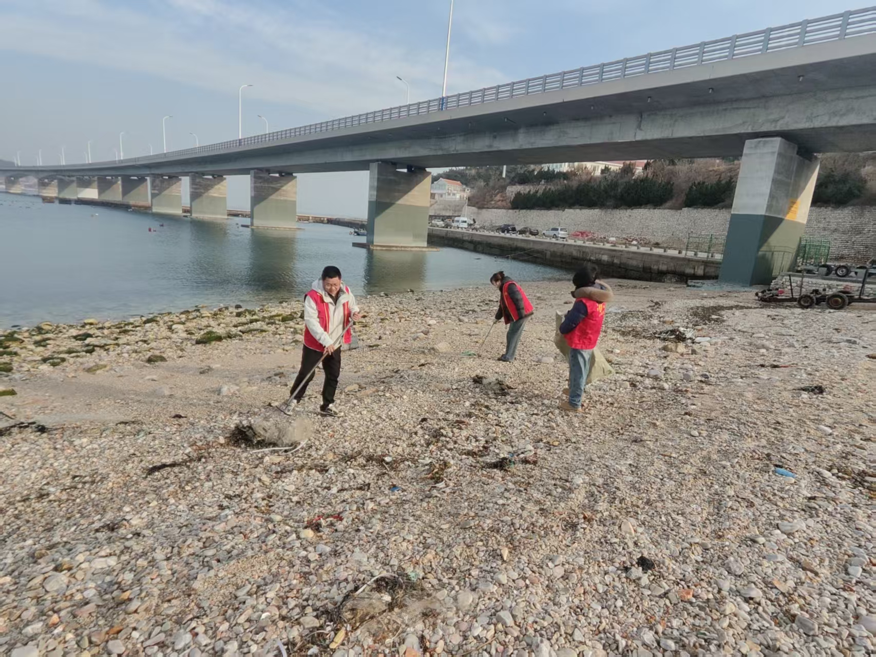 12月10日,组织志愿者携带扫帚、垃圾袋等工具到南北长山联岛大桥处捡拾白色垃圾,清理周边环境卫生。