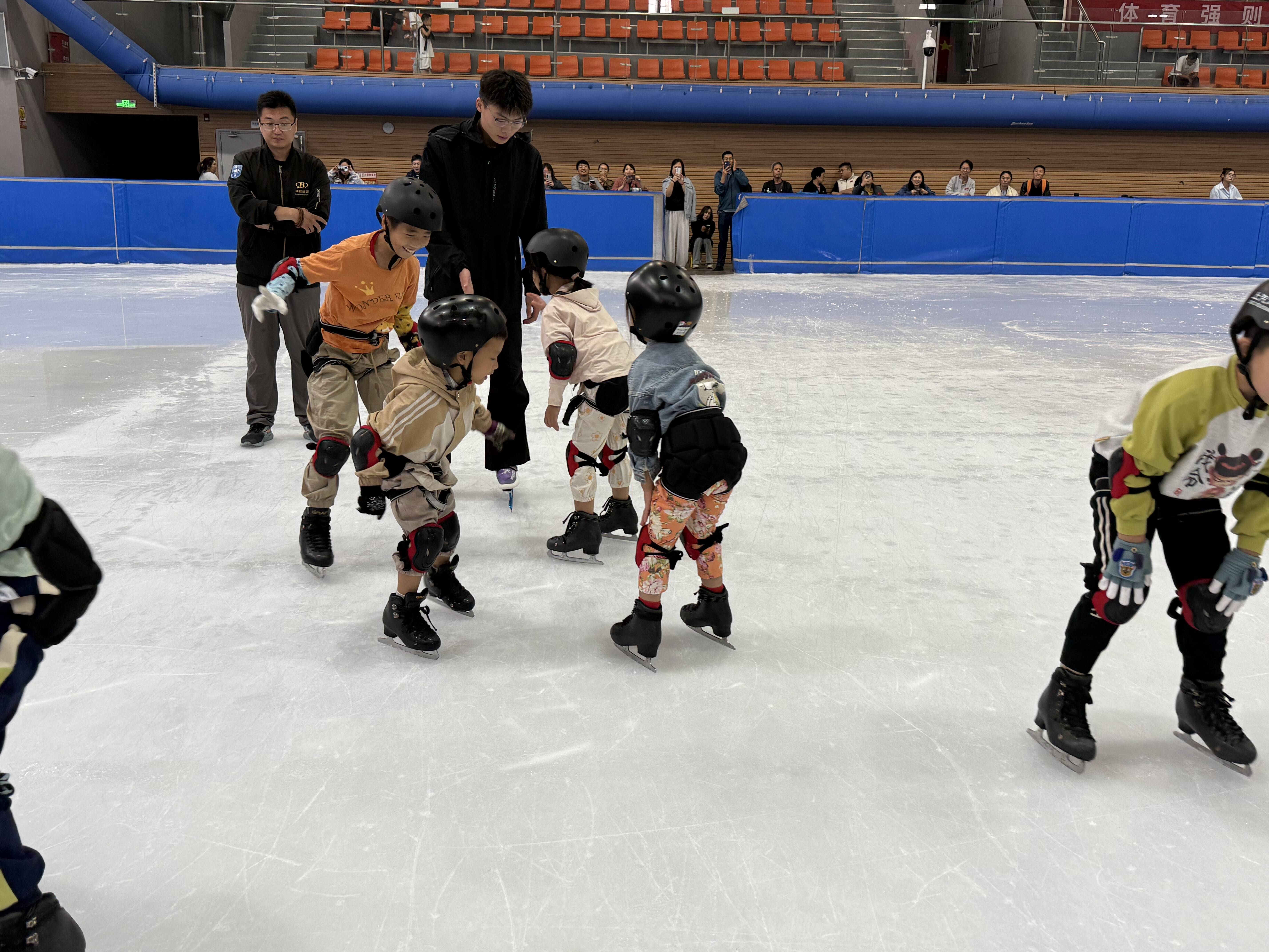 在研学实践环节,孩子们在教练的鼓励下尝试滑行,从最初的小心翼翼到逐渐找到节奏,不少孩子成功完成了短距离滑行;家长们则全程守护,记录下孩子成长的瞬间,亲子间的互动既温暖又充满力量。此外,活动还设置了冰上知识讲座,宣传冰球、花样滑冰等体育项目的相关知识,进一步扩大了亲子家庭对冰上运动的认知,也让家长们在讲座中了解到冰上运动对孩子发展的诸多益处。